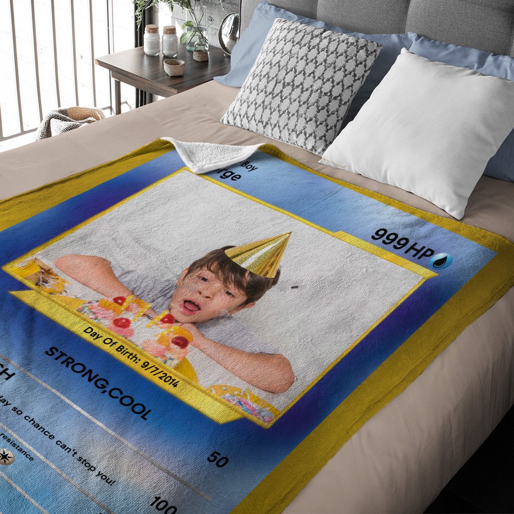 This unique throw blanket is inspired by collectible game cards, blending playful and nostalgic elements. It features printed photos and customizable text, allowing you to upload pictures of your pets, family, or memorable moments to create a personalized blanket that is truly one-of-a-kind.