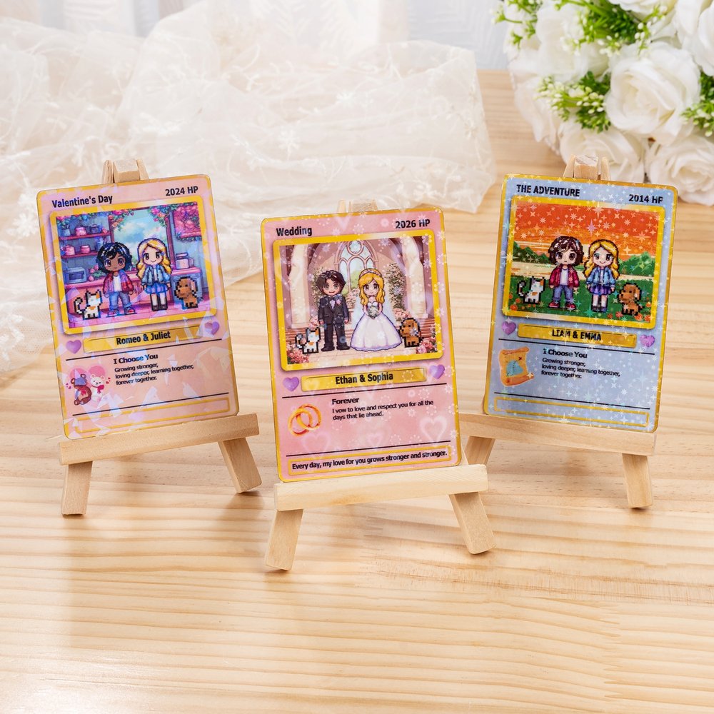 These cards can serve as precious collectibles, unique and exquisite party gifts, or as game props for game-themed birthday celebrations and parties. With a wooden holder, they can also be charming home decorations, placed on tables or shelves. The cute pixel characters and personalized text add a touch of warmth and individuality to any living space.
