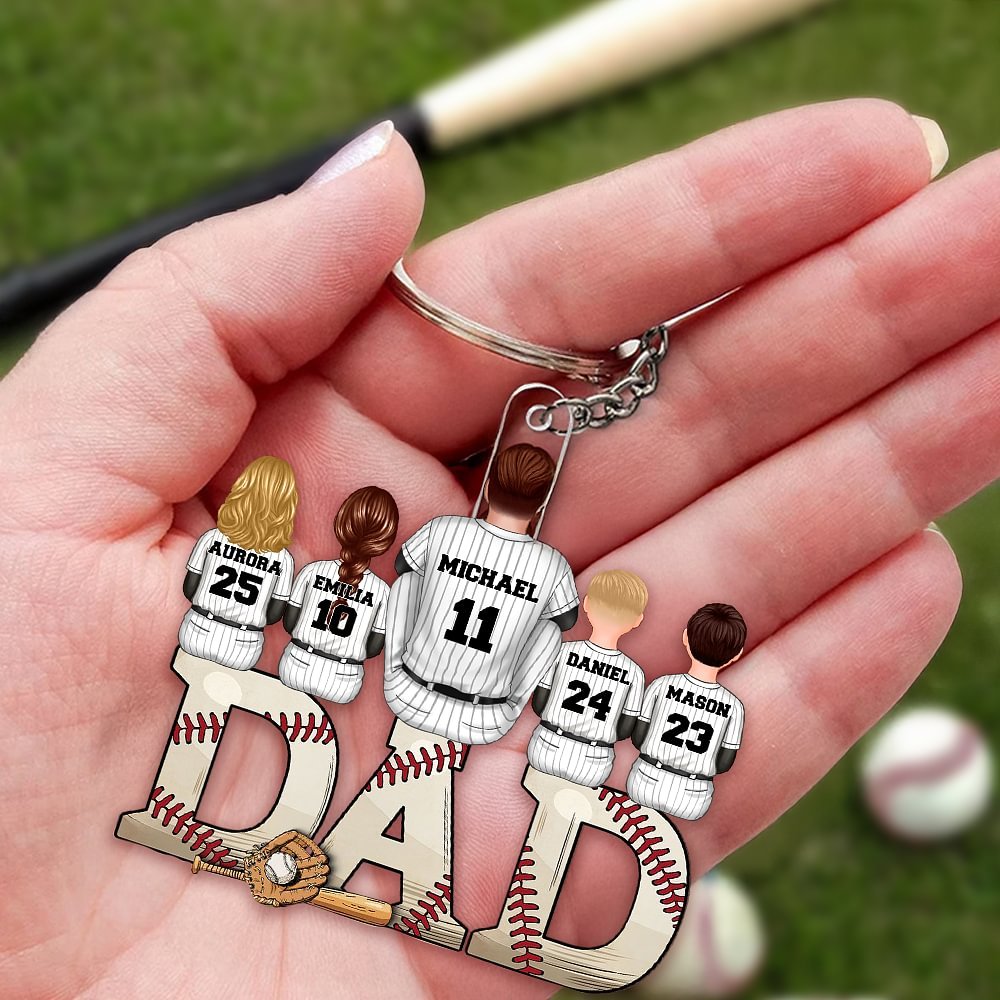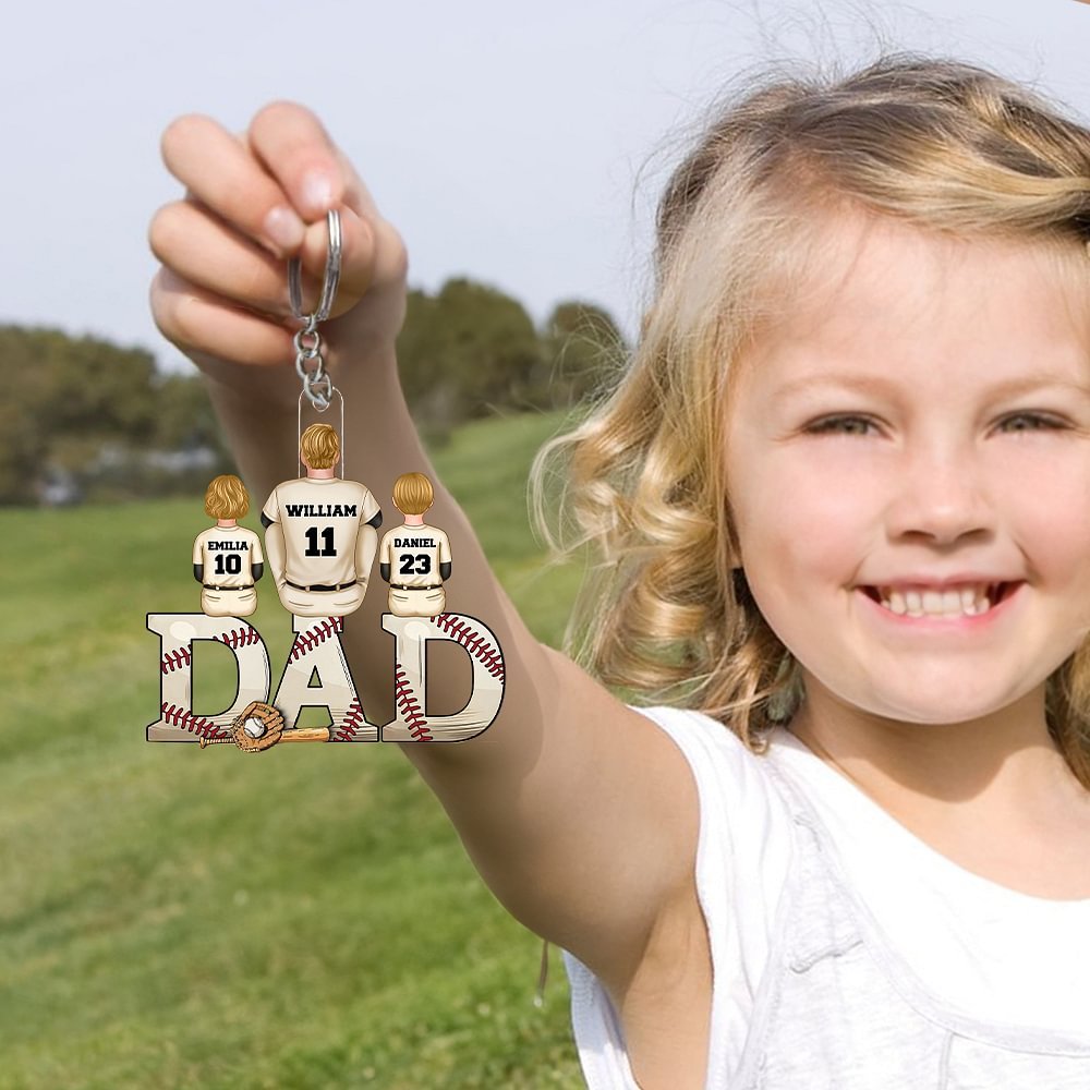 This acrylic keychain perfectly combines baseball elements with the letter "DAD," conveying both your love for baseball and your respect for your father. The cartoon design of a dad sitting on the letter "A" with children gathered around him depicts the deep emotional bond between parents and kids. Additionally, you can add names and numbers on the backs of the dad and the children, giving this keychain a personalized touch.