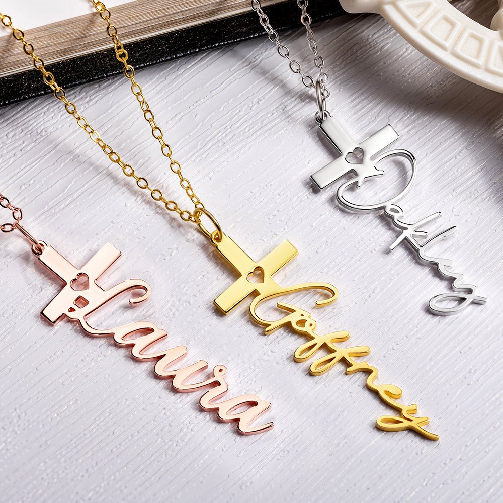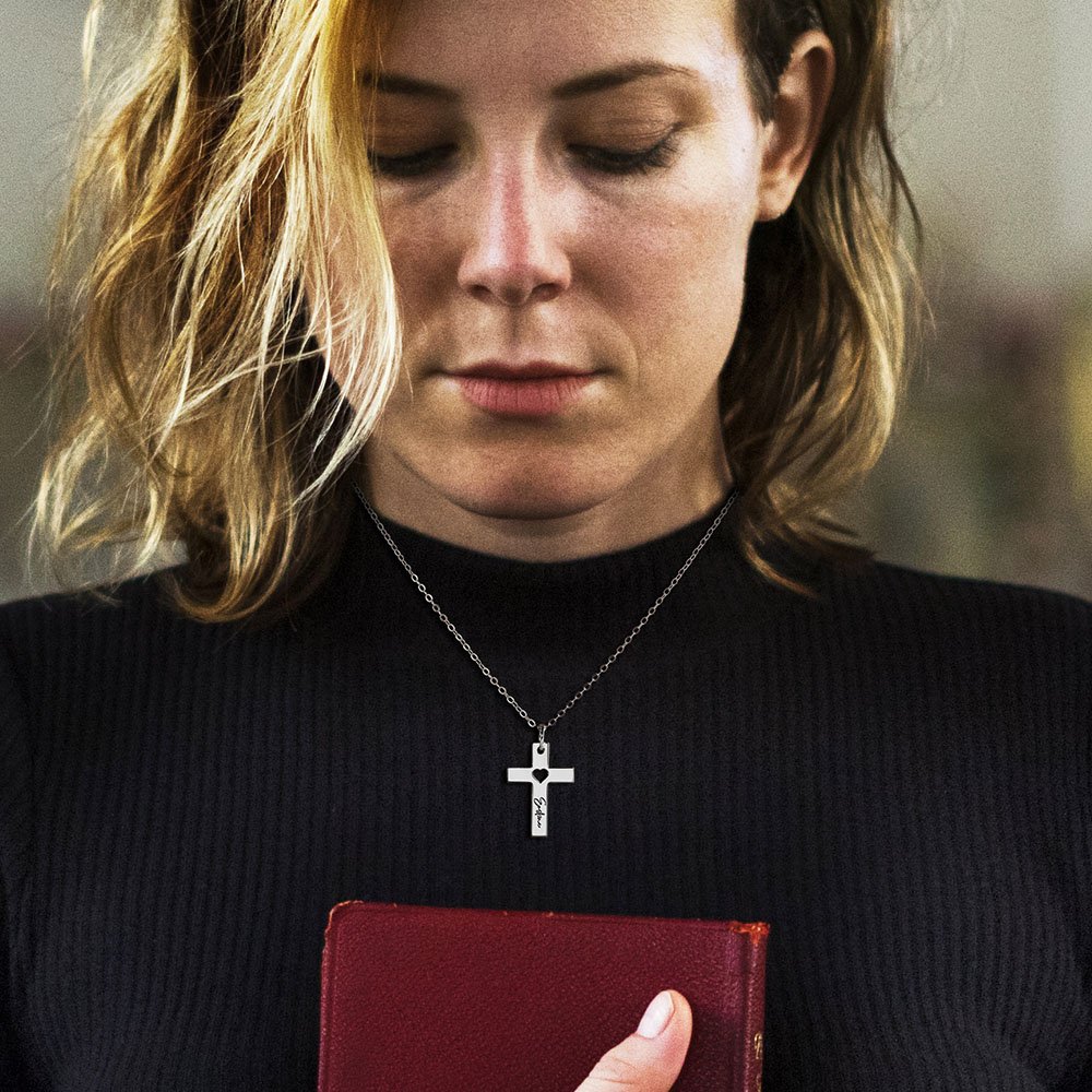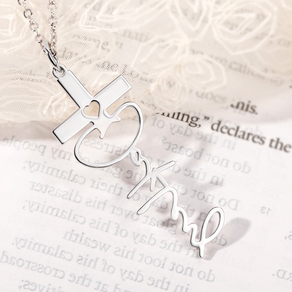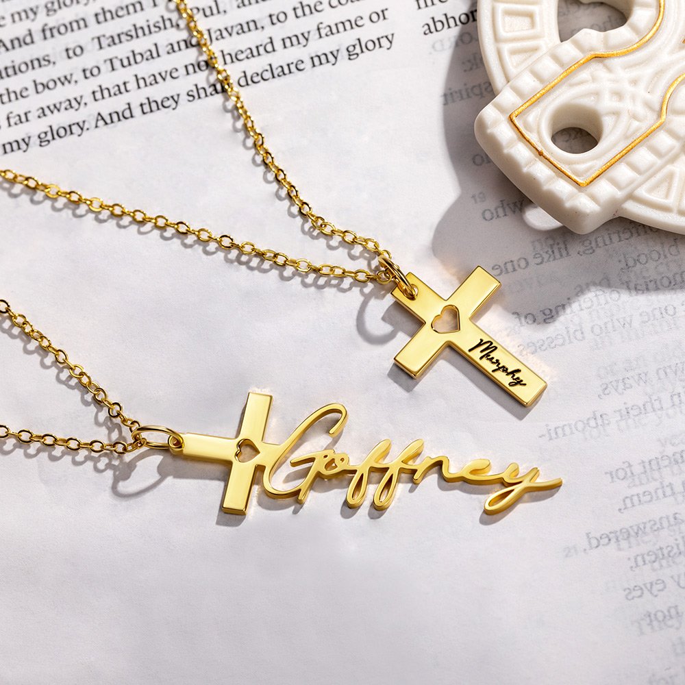 This necklace cleverly combines the symbolism of love and faith. The cross has a hollow heart in the center, showing a warm and pious emotion. There are two styles to choose from, one with a name cut and the other with an engraved name. You can choose the right customization method to make it a unique and exclusive piece of jewelry.