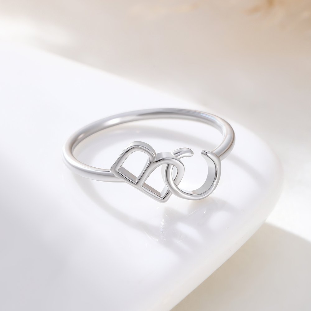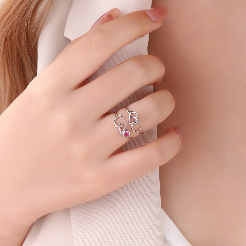 This ring features interlocking initials, each entwined to create a sense of three-dimensionality. The ring is accented with your birthstone, creating a simple yet sophisticated look. Displaying two meaningful initials adds a personal touch and visually enhances the ring, adding a unique charm and timeless style.