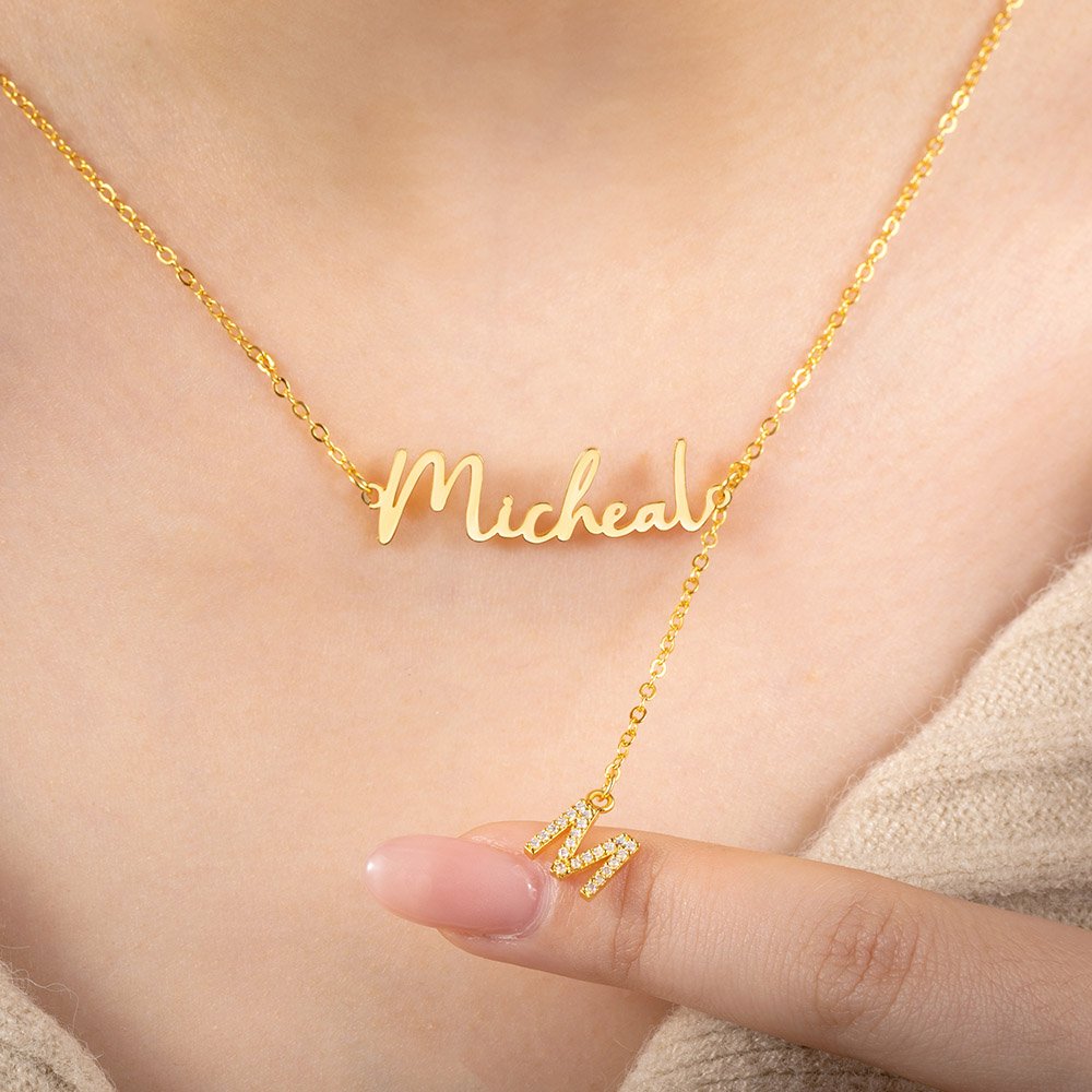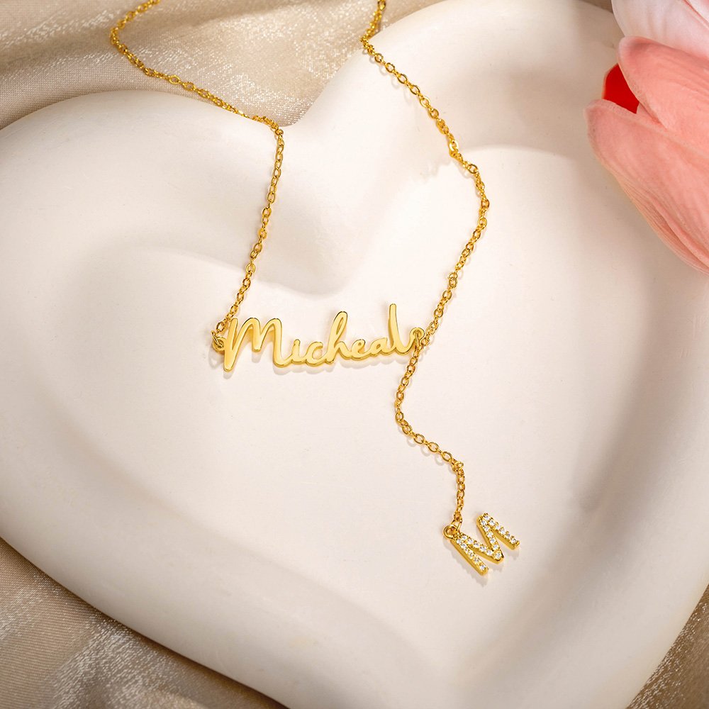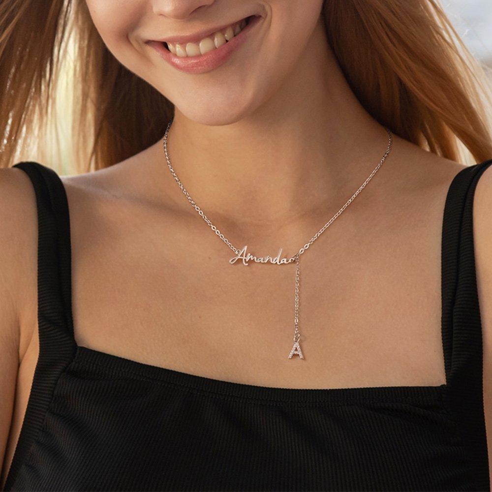 This personalized delicate name necklace features a sleek and modern design. You can personalize it with the recipient's name, making it a truly one-of-a-kind piece. The dangling initial charm with white zirconia stones below the name creates a unique and eye-catching element, making it stand out from ordinary necklaces.
