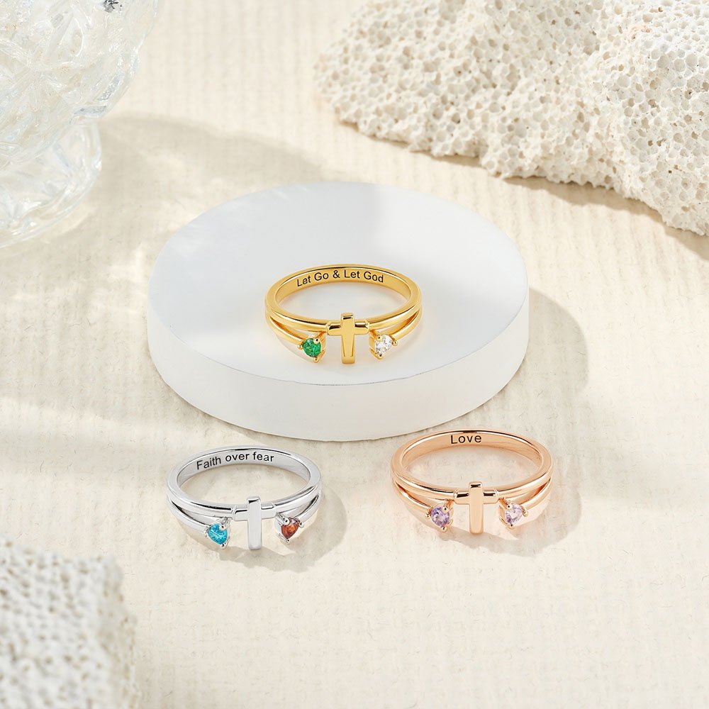 Designed with ingenuity, the ring incorporates the cross element, symbolizing firm faith and offering spiritual sustenance. With birthstones dotted on the left and right, they can be customized according to the birthdays of your lover or your family, adding uniqueness and personality. Words can also be engraved, making the whole simple yet meaningful, with an overwhelming sense of exquisiteness.