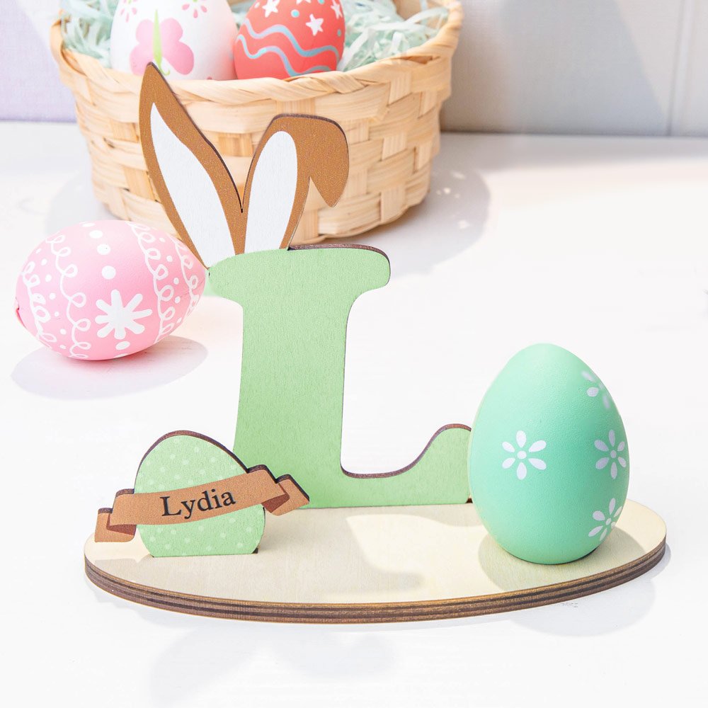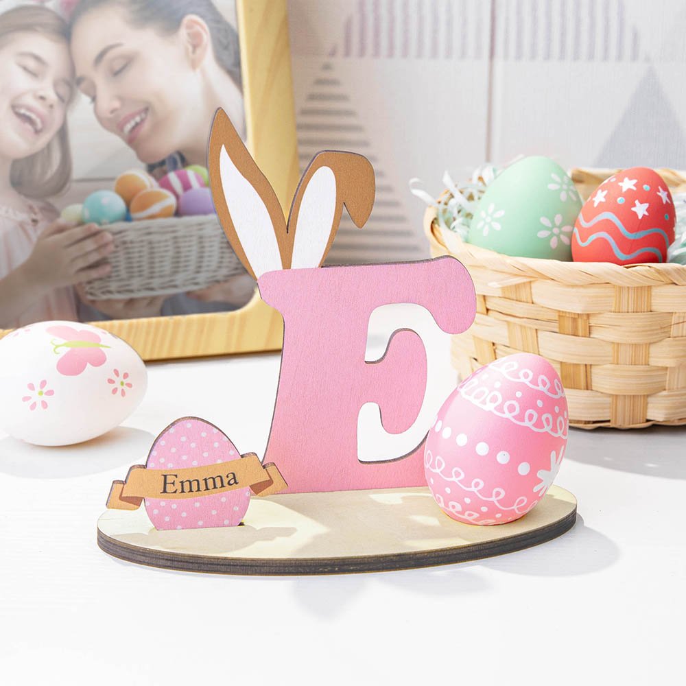 A super cute and personalized stand-alone litter tray! This egg stand with easter bunny lettering can personalize your child's name to make holiday parties even more special.
