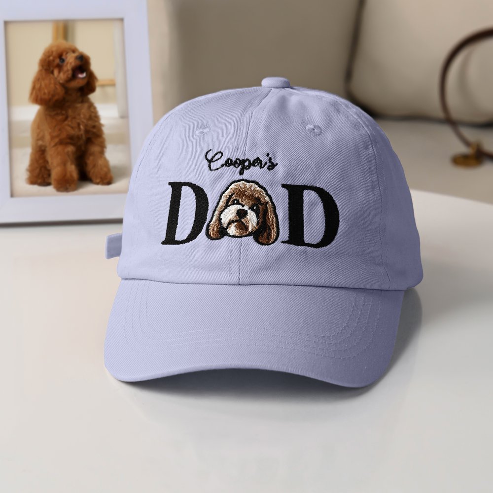 Turn your beloved pet's photo into a cute cartoon, expertly embroidered on a baseball cap to add a playful touch to this standout accessory, cherished by pet owners. The cap can also be personalized with "Mom" or "Dad" and your pet's name, a thoughtful detail that lets you proudly show your love for your furry friend.