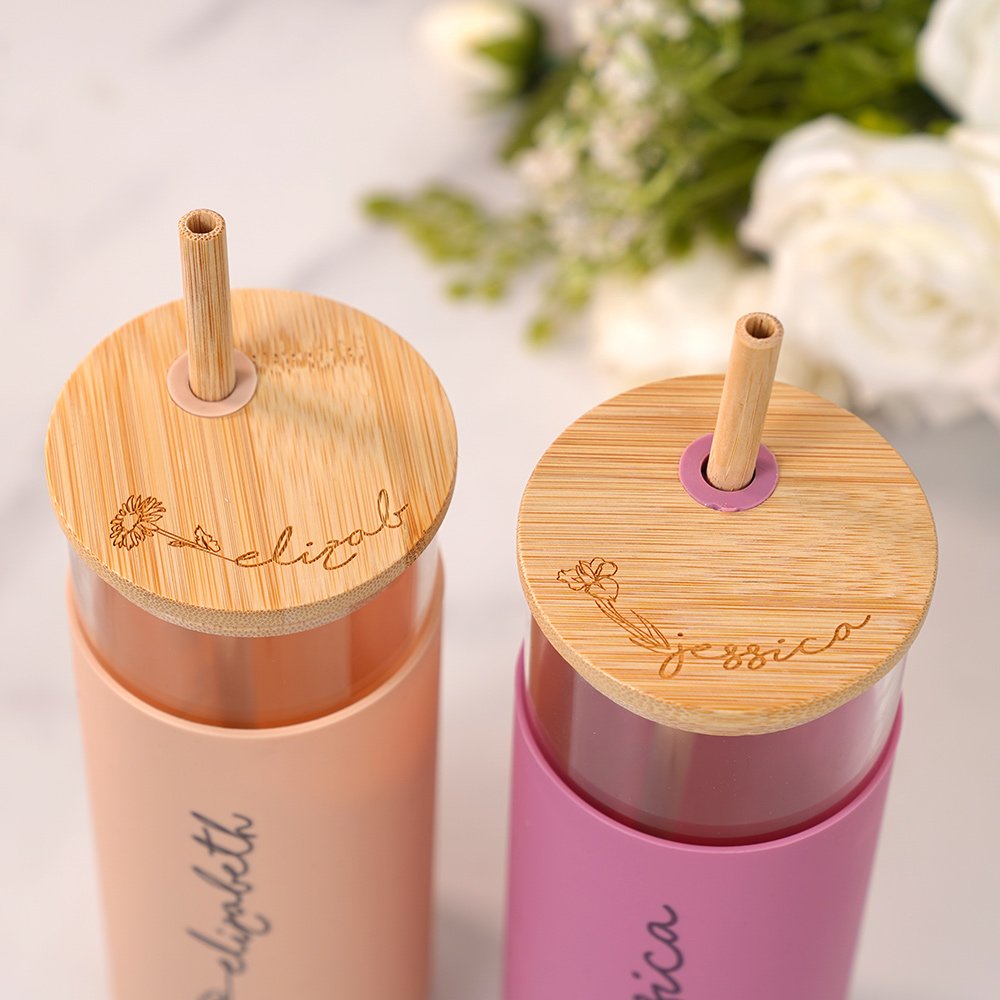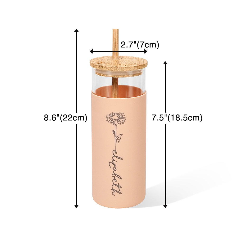 Indulge in the luxury of personalization with our 17oz glass tumbler. We use laser engraving of names and birthday flowers of your choice onto the silicone sleeve of the tumbler and bamboo lid. This engraving is permanent, ensuring that your tumbler remains a timeless keepsake.