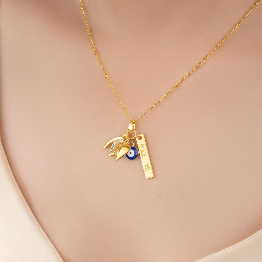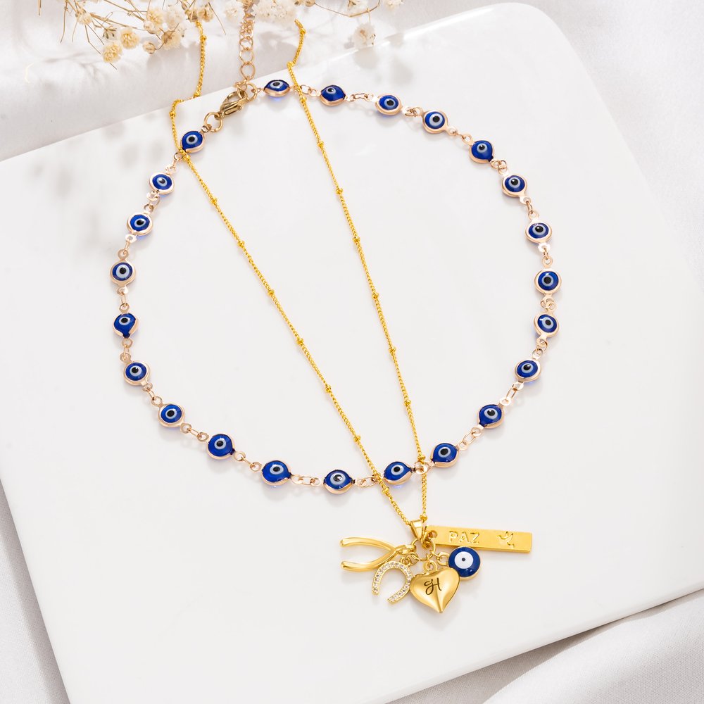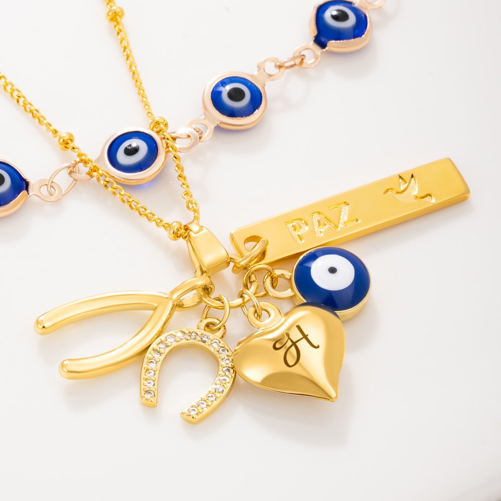 This necklace set features the mystical allure of the blue and white evil eye—a symbol deeply rooted in cultures like Turkey and Greece, where it's believed to ward off negative energy and offer protection. One necklace showcases a distinctive combination of meaningful pendants: a heart embodying love and kindness, a dove representing peace, a wishbone for luck and fulfilled wishes, and a horseshoe symbolizing protection and fortune. It can also be customized with a name, making it truly one-of-a-kind.