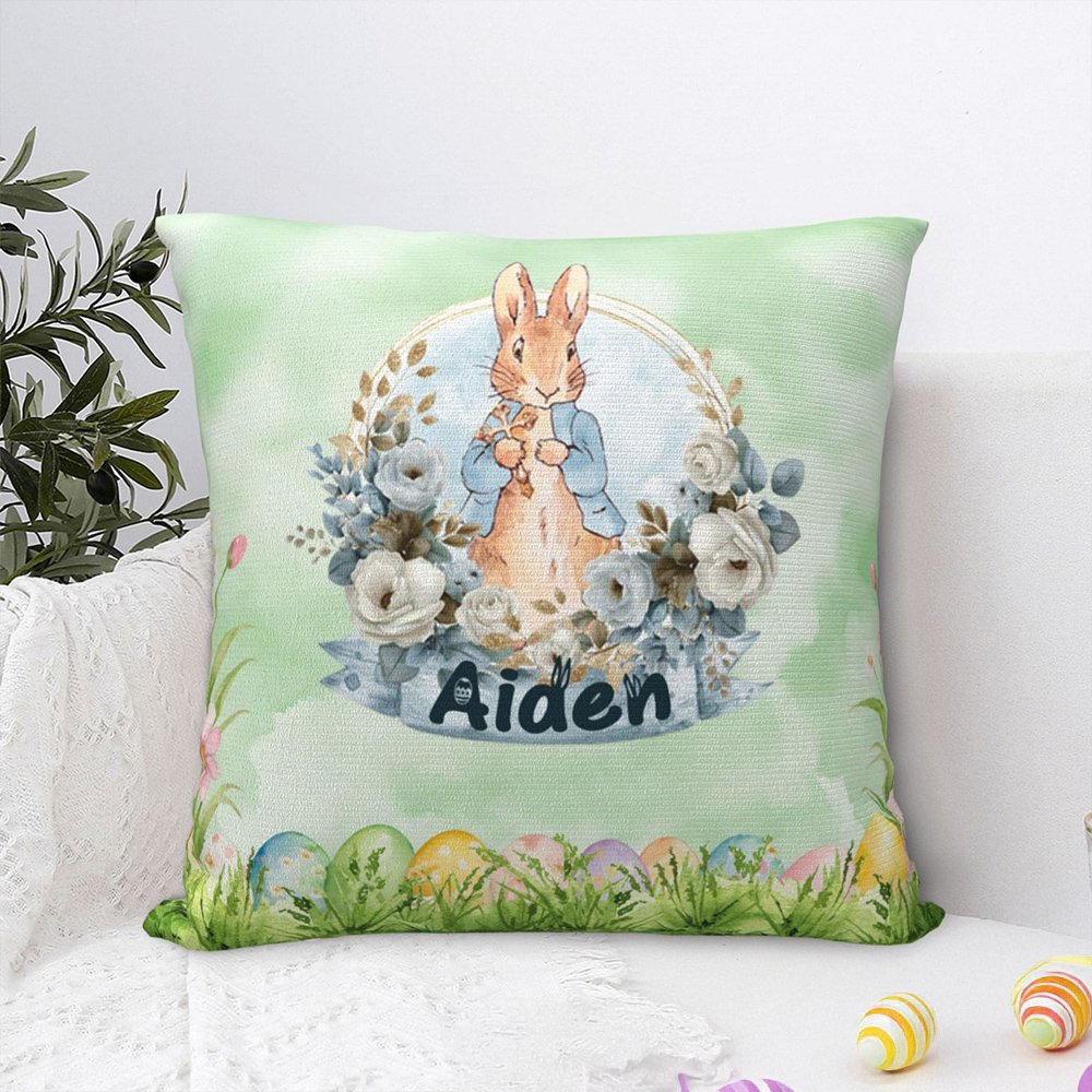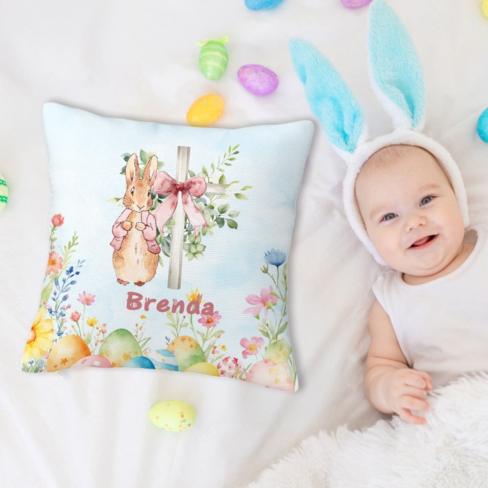 This pillow cover features a delightful combination of Easter elements, including the beloved Peter Rabbit, a floral cross, bows, colorful Easter eggs, a watercolor background, and a customizable name. It's the perfect addition to any Easter celebration or springtime decor, bringing a sense of whimsy and cheer.