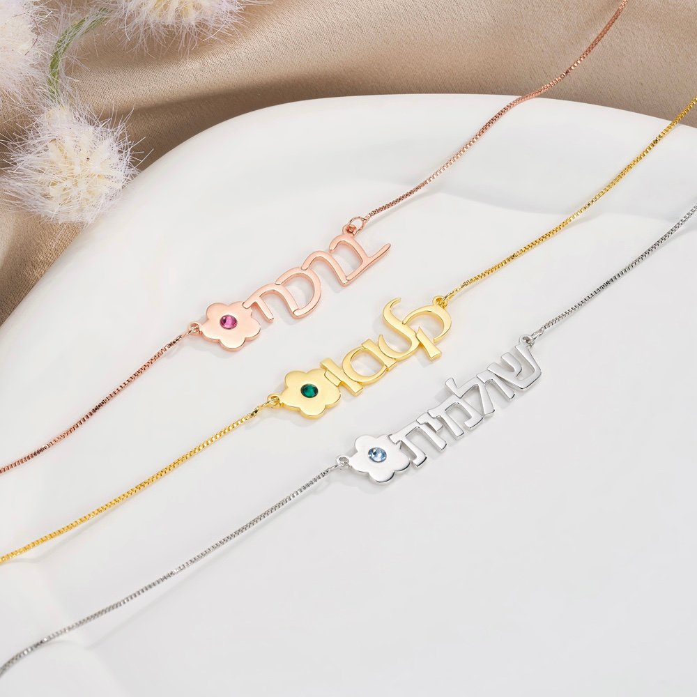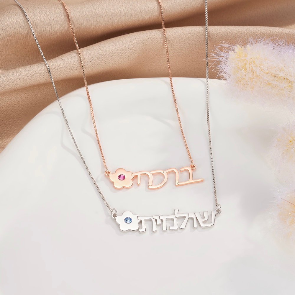 Featuring a delicate floral design and the wearer's Hebrew name, this necklace is a unique and meaningful way to celebrate Jewish heritage. The flowers are decorated with birthstones in the center, and the style is sweet and lovely, suitable for women or young girls to wear.