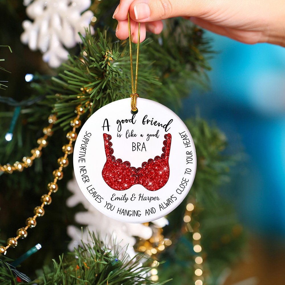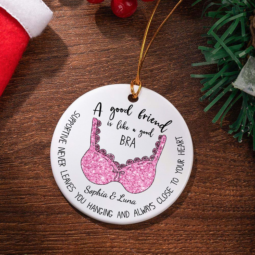 This whimsical ornament features the funny sayings "A good friend is like a good bra" and "Supportive never leaves you hanging and always close to your heart" capturing the essence of true friendship. It's a lighthearted reminder of the comfort and support that friends provide, perfect for spreading holiday cheer. You can customize it with your and your friends' names to make it more unique.