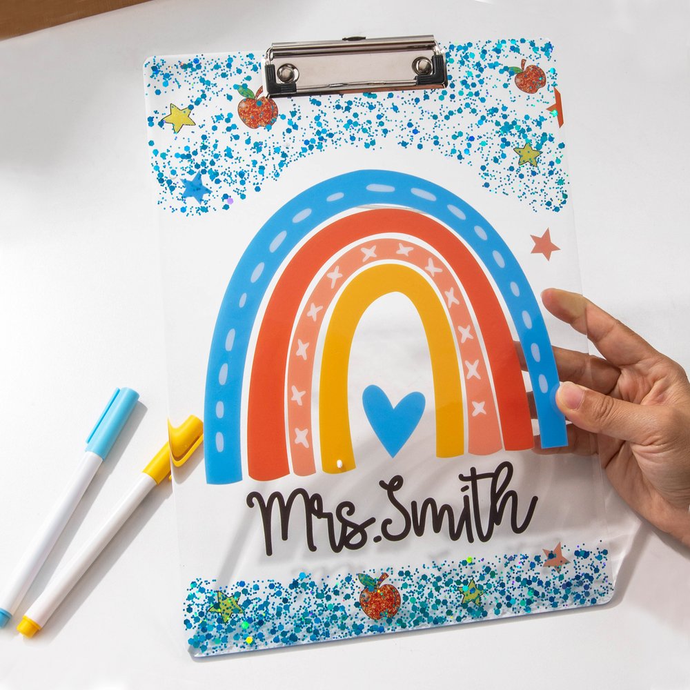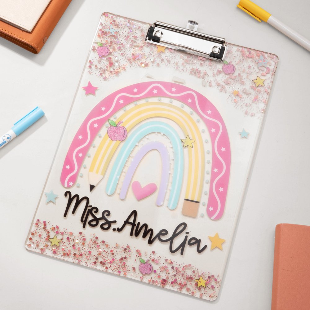 Centered around a distinctive design featuring sequins paired with a rainbow motif, this clipboard can be customized with the teacher's name. Its vibrant colors and stylish shape combine visual appeal with a sense of exclusivity. Breaking away from the monotony of traditional clipboards, it becomes a personalized keepsake that carries respect.
