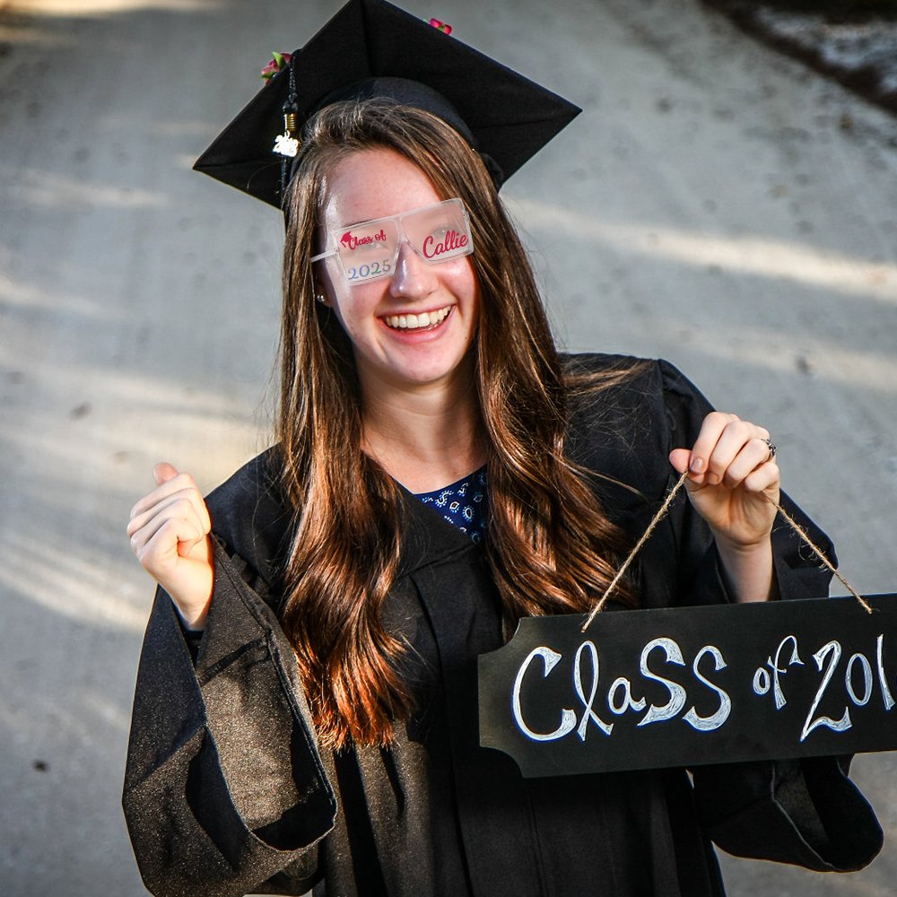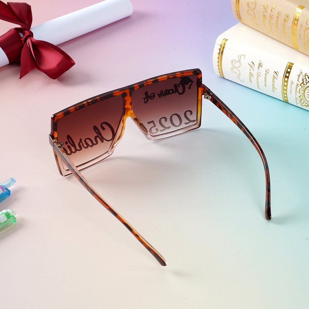Combining the 'Class of + graduation cap' design with a modern square frame, these glasses are the perfect blend of sleek sophistication and youthful energy. The gradient colors add a vibrant touch, while our wide range of frame color options ensures there's one that perfectly matches your style. Plus, make it truly yours by customizing the text and choosing from 22 font colors to express your unique personality.