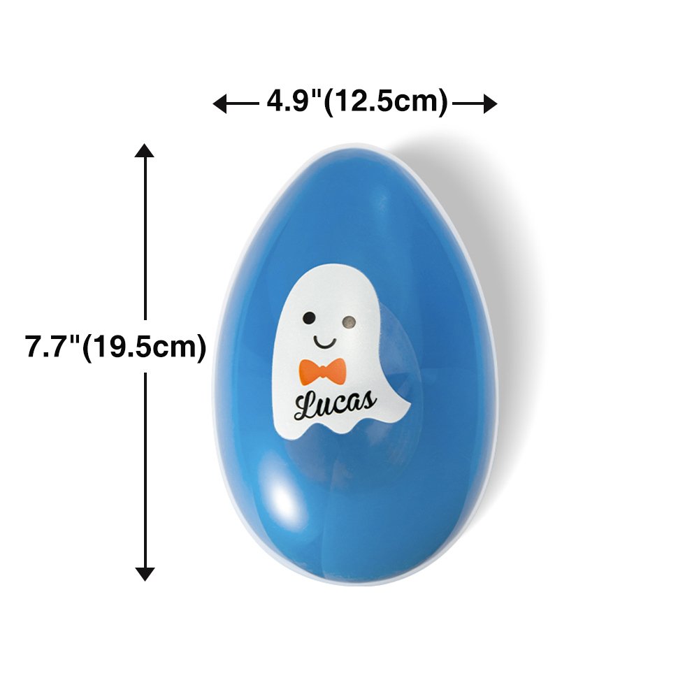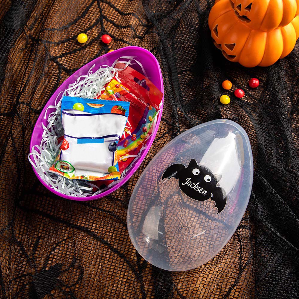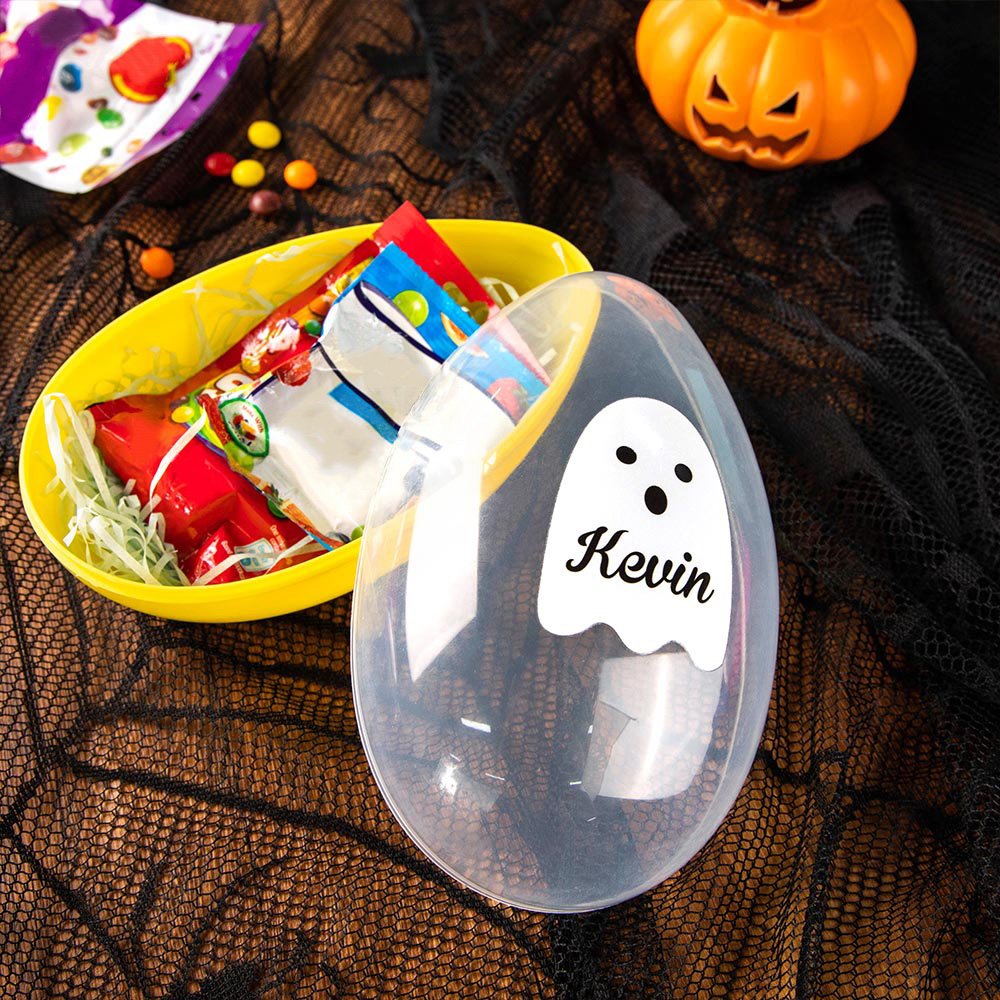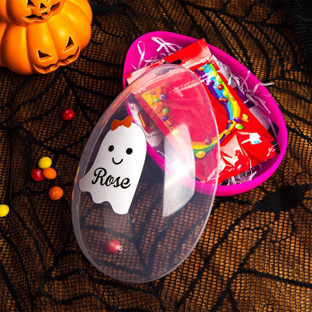 Each plastic egg has a brightly colored bottom half and a clear top half, you can see the contents even when closed. The clear half is printed with adorable ghost or bat designs, making it a visually appealing Halloween accessory. Moreover, you can personalize the kid's name, adding an extra special touch to the gift.