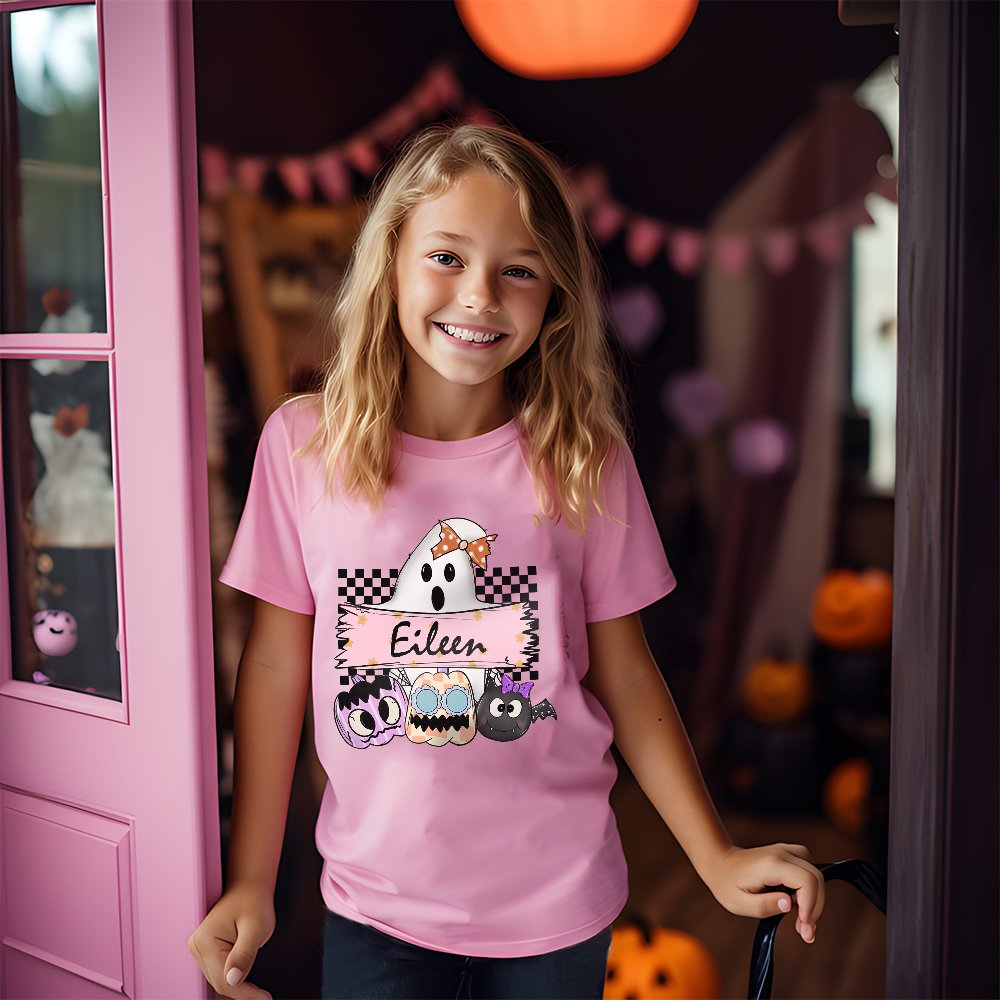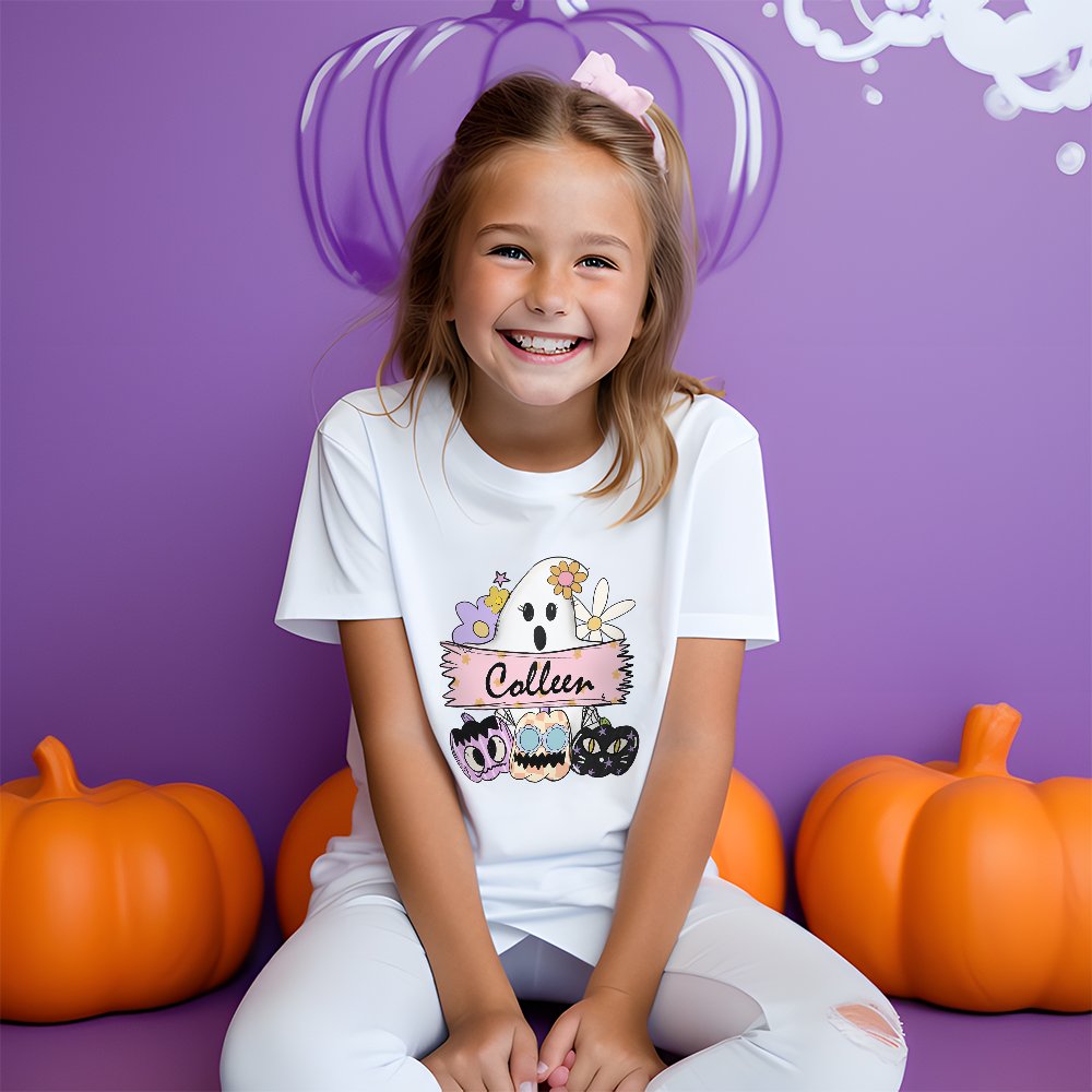 The shirt features an adorable spooky ghost holding a mysterious sign with a pumpkin in the shape of a bat or black cat. This symbolizes a mother leading her children through the Halloween season, carrying a sign as if shouting slogans for your joyous celebrations.