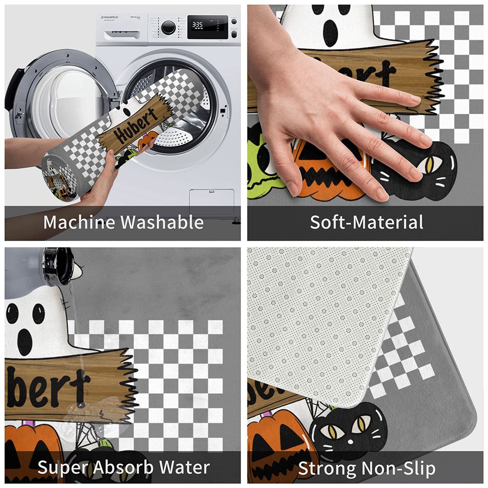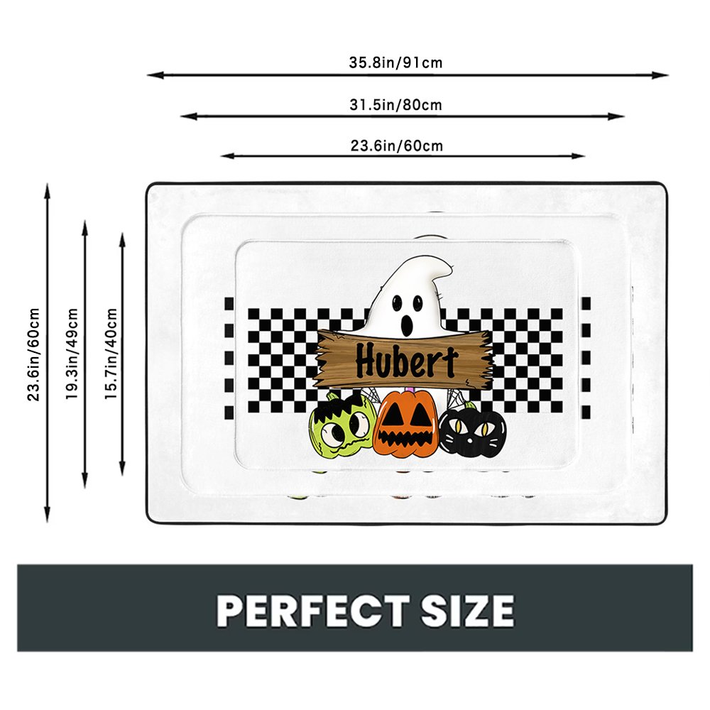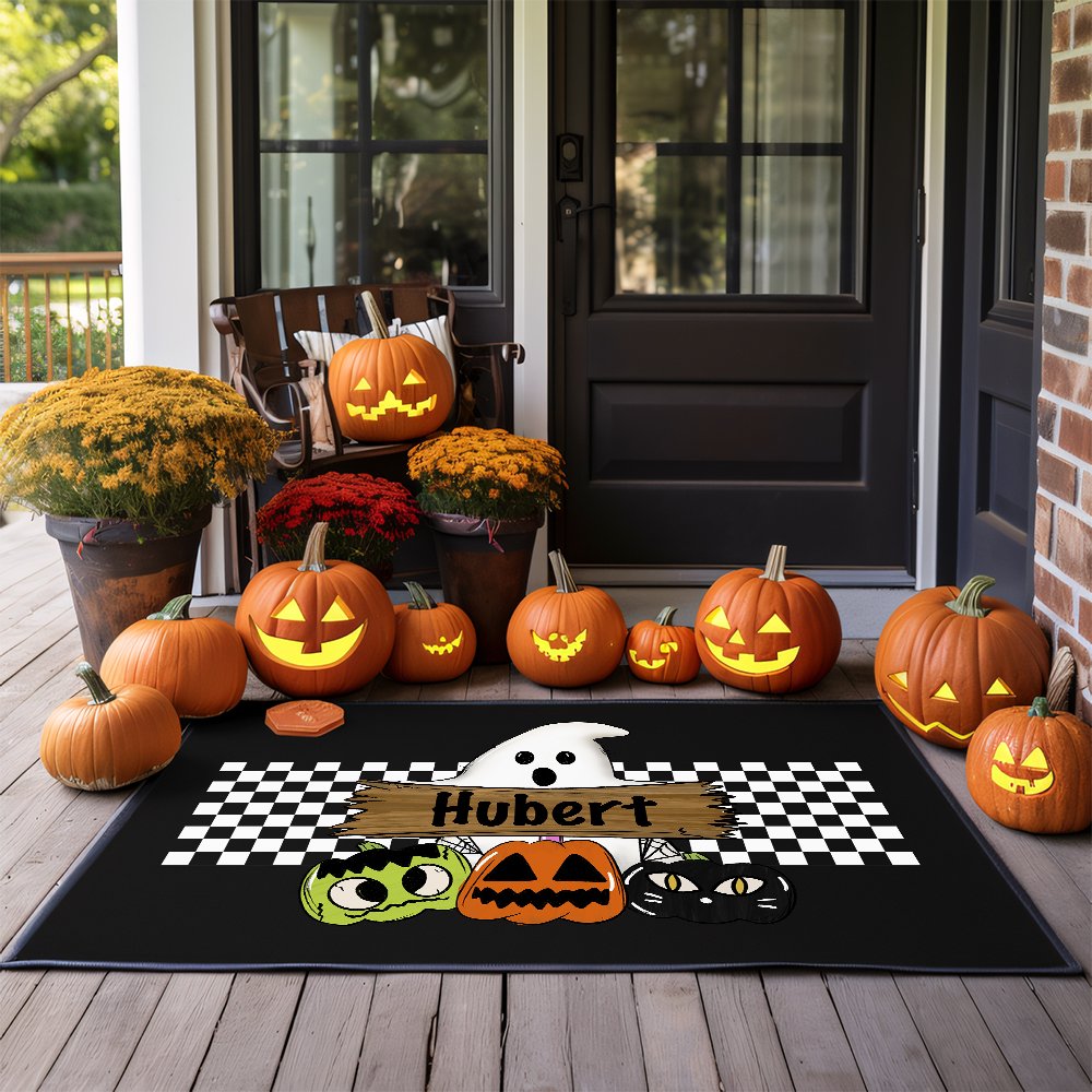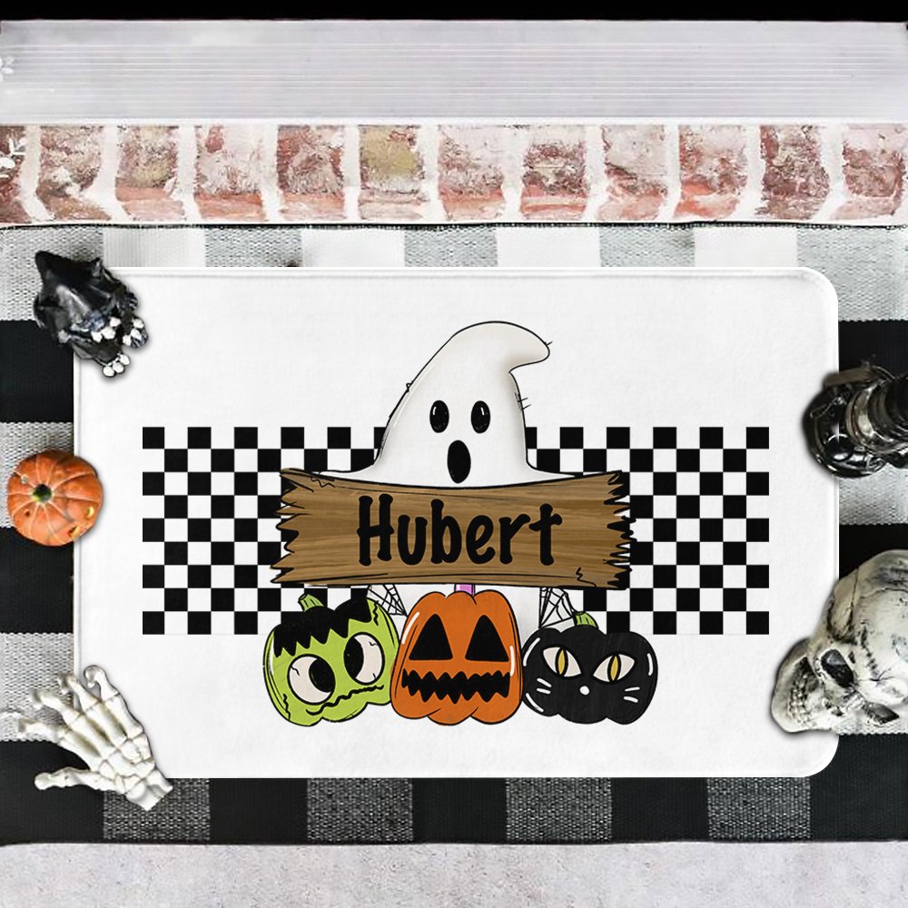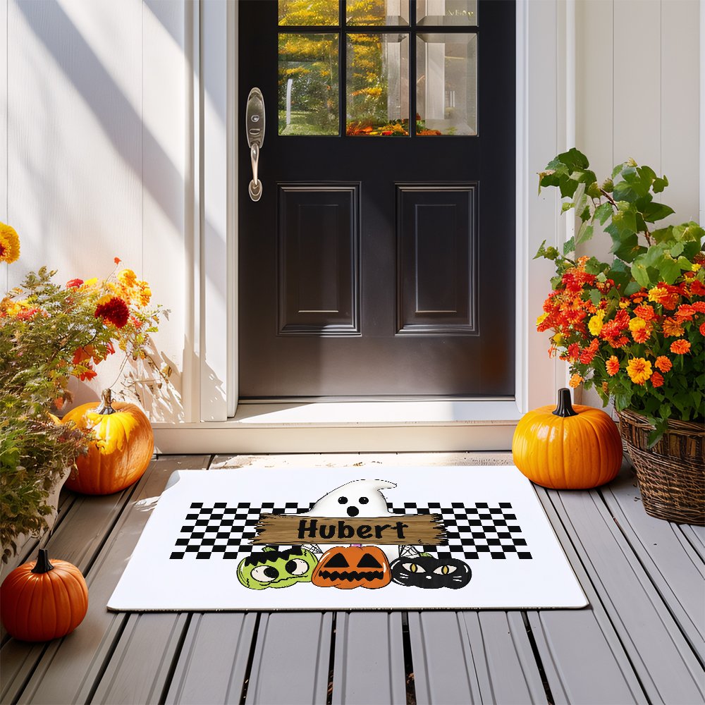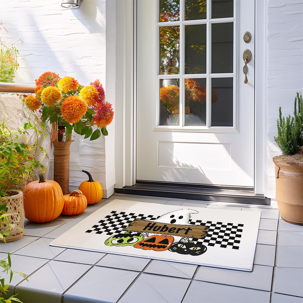 The personalized happy Halloween doormat is the perfect accessory for Halloween parties or home decorations. It is printed with a cute ghost holding a mysterious sign, paired with a bat or black cat-shaped pumpkin, creating a festive atmosphere in celebration of Halloween. You can customize the text on the wooden sign, making it a unique and standout Halloween home decoration.