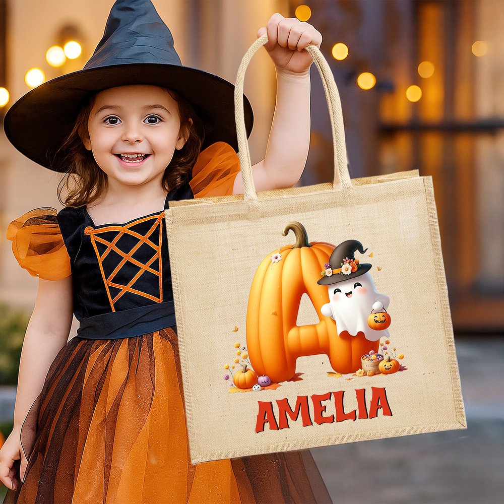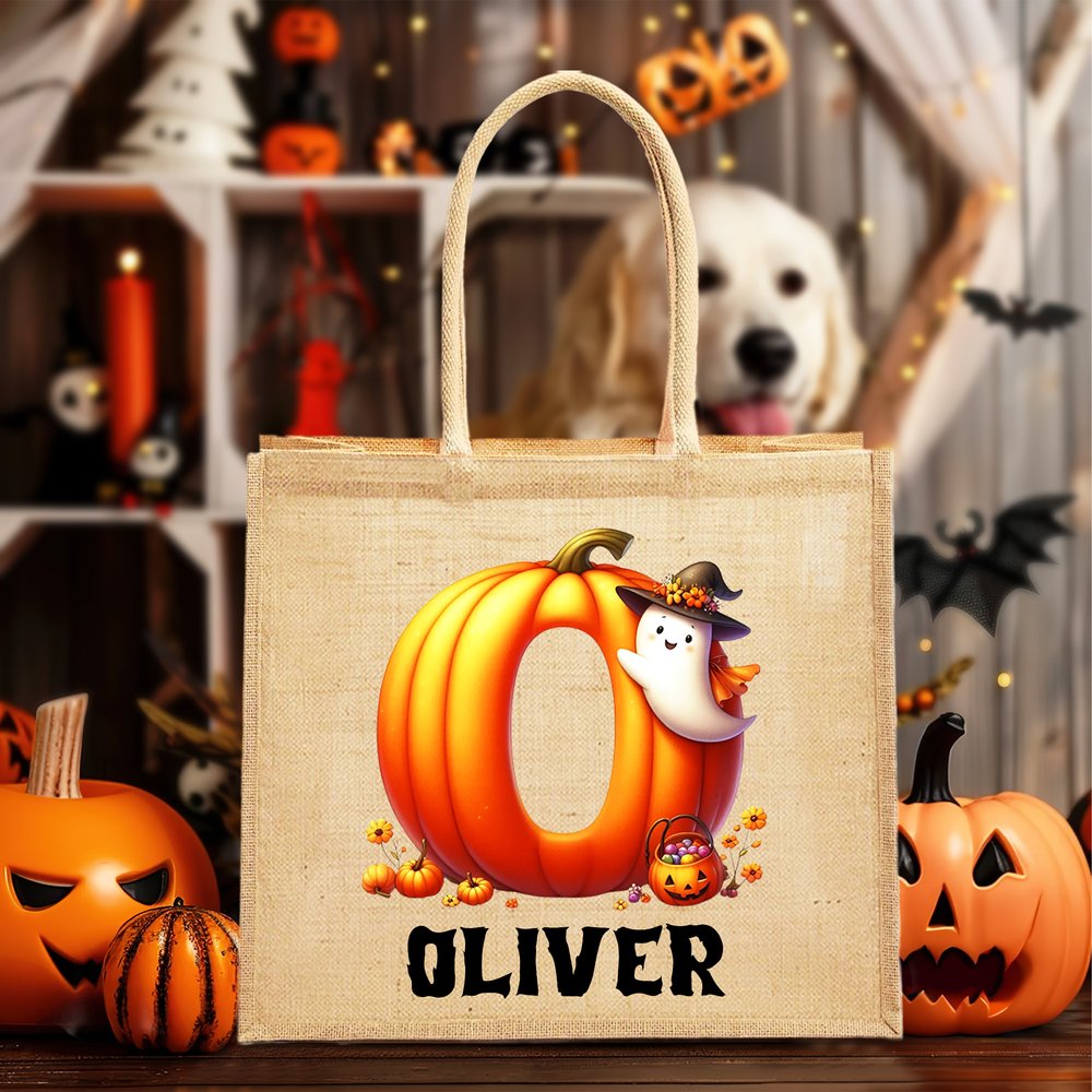 The bag features pumpkin initials and ghost graphics for a delightful Halloween theme. Customizing with your child's name is fun and engaging, and it enhances the holiday spirit and adds a festive touch to any Halloween event.