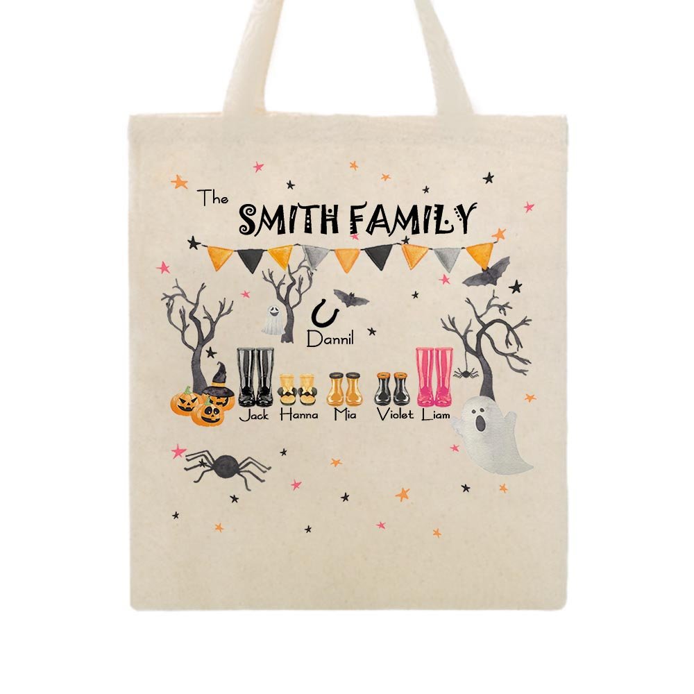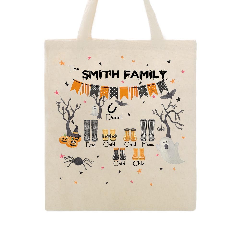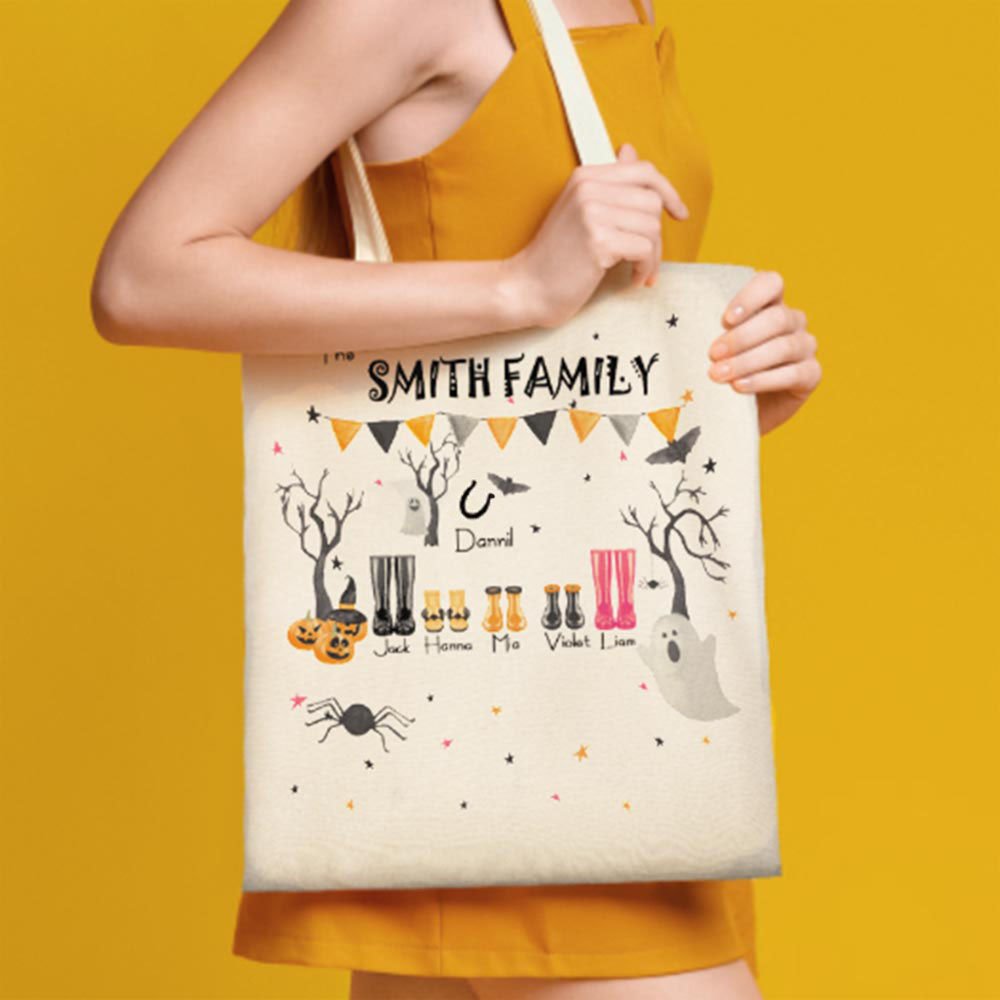 This Halloween Canvas Bag combines elements such as rain boots, pets, bats, little stars, ghosts, etc. The style is lively and cute, and the names of family members and the style of rain boots can be customized to represent family love and unity. Bring it and have a happy Halloween together!
