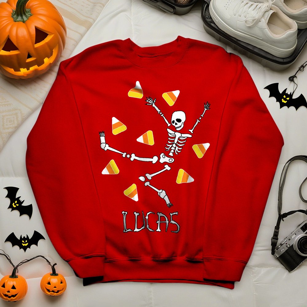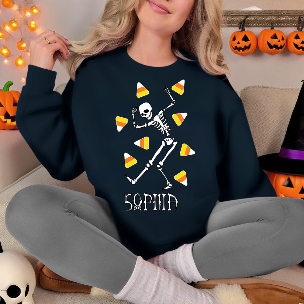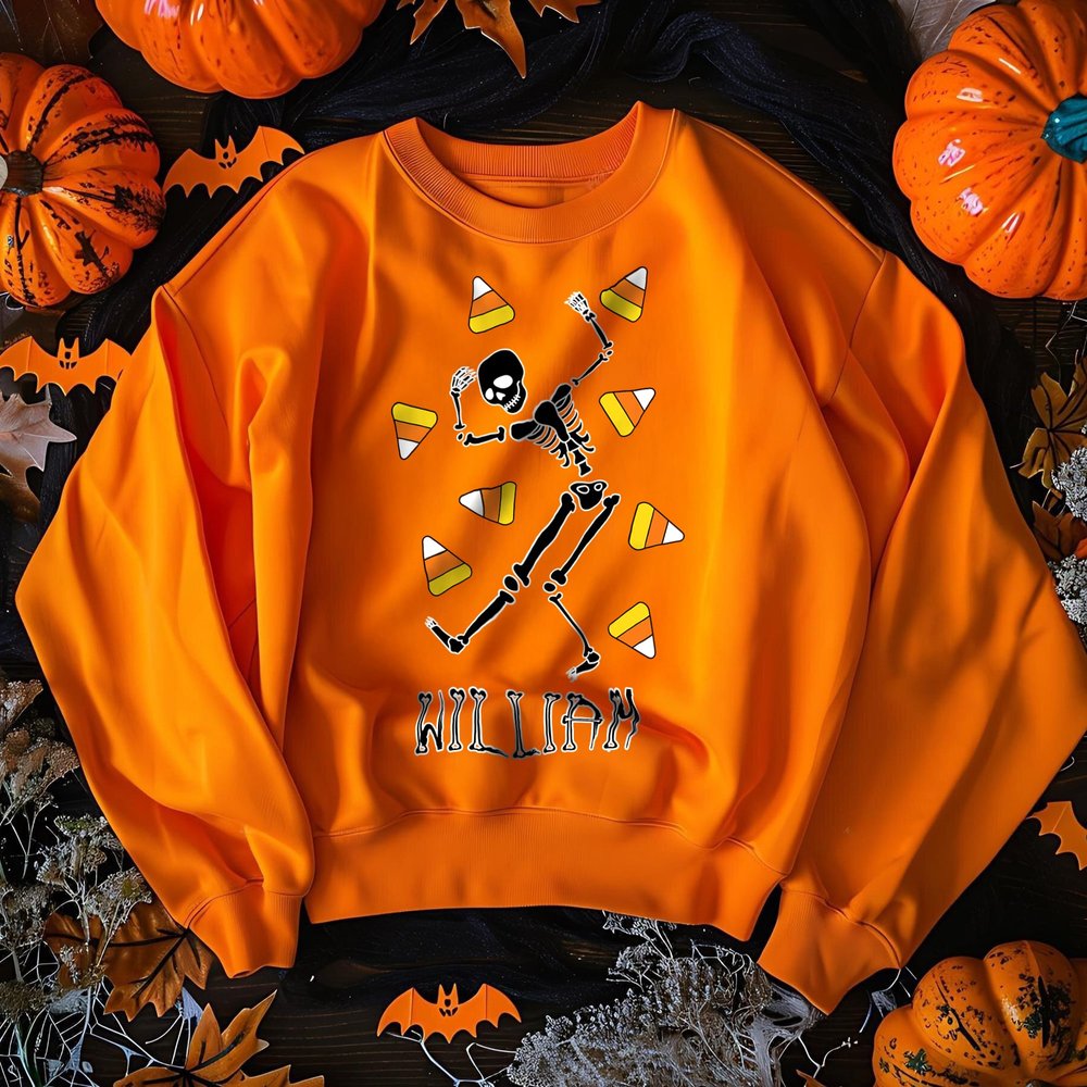 Centered around classic Halloween elements like Skeletons, corn candy, pumpkins, and lollipops, this design features vibrant colors and a playful style, creating an overall festive atmosphere filled with mystery and joy. Supports custom names with seven Skeleton designs to choose from, transforming the hoodie from generic holiday wear into a unique expression of individuality.