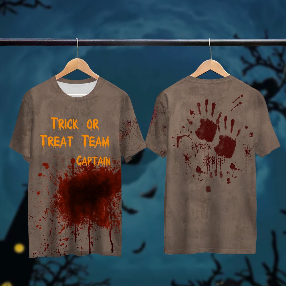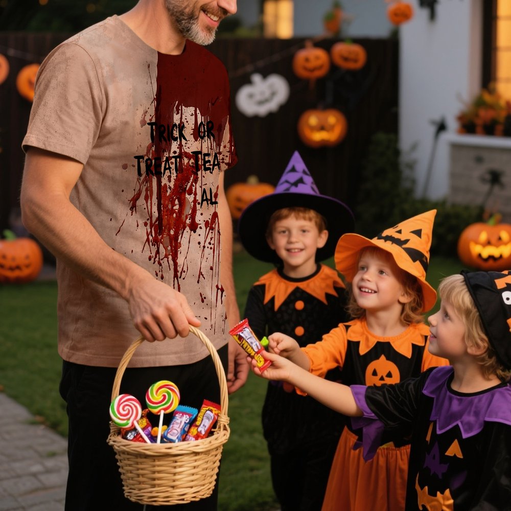 This Halloween-themed T-shirt features a funny design that captures the spirit of the season. The simulated blood splatter adds a touch of horror-movie charm, perfect for those who enjoy a good scare. What's more, you can also add the words you want to express and your own name on the T-shirt to make it more personalized.