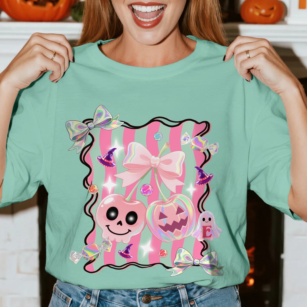 Personalized Halloween Theme Preppy Coquette T-shirt Sweatshirt with Initial Halloween Party Gift for Family Friends