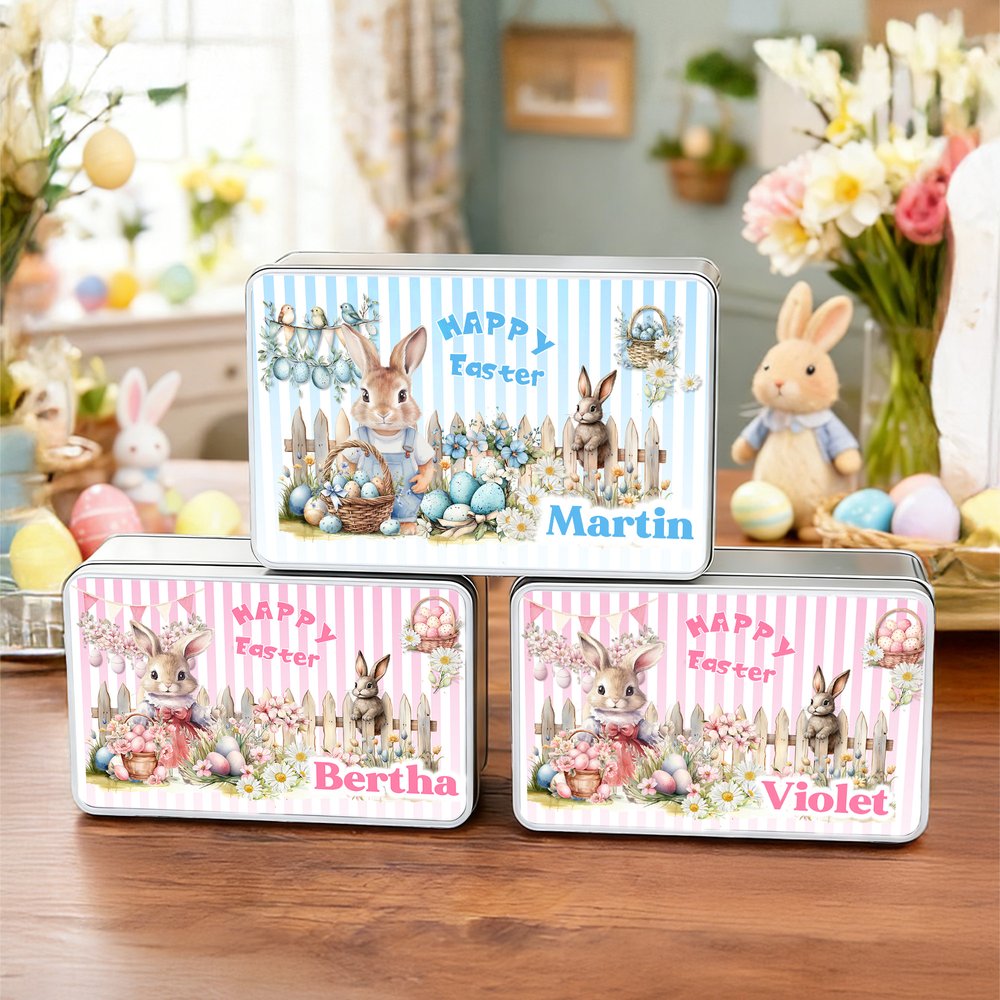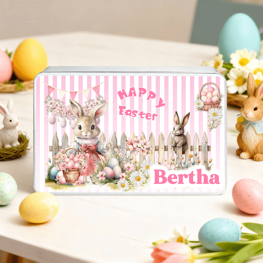 This cookie box centers around an Easter bunny theme, with box surfaces available in two adorable bunny designs in pink and blue, adorned with Easter eggs and floral motifs. Supports customization with a child's name to create a one-of-a-kind personalized gift, adding delightful surprises for every little one.