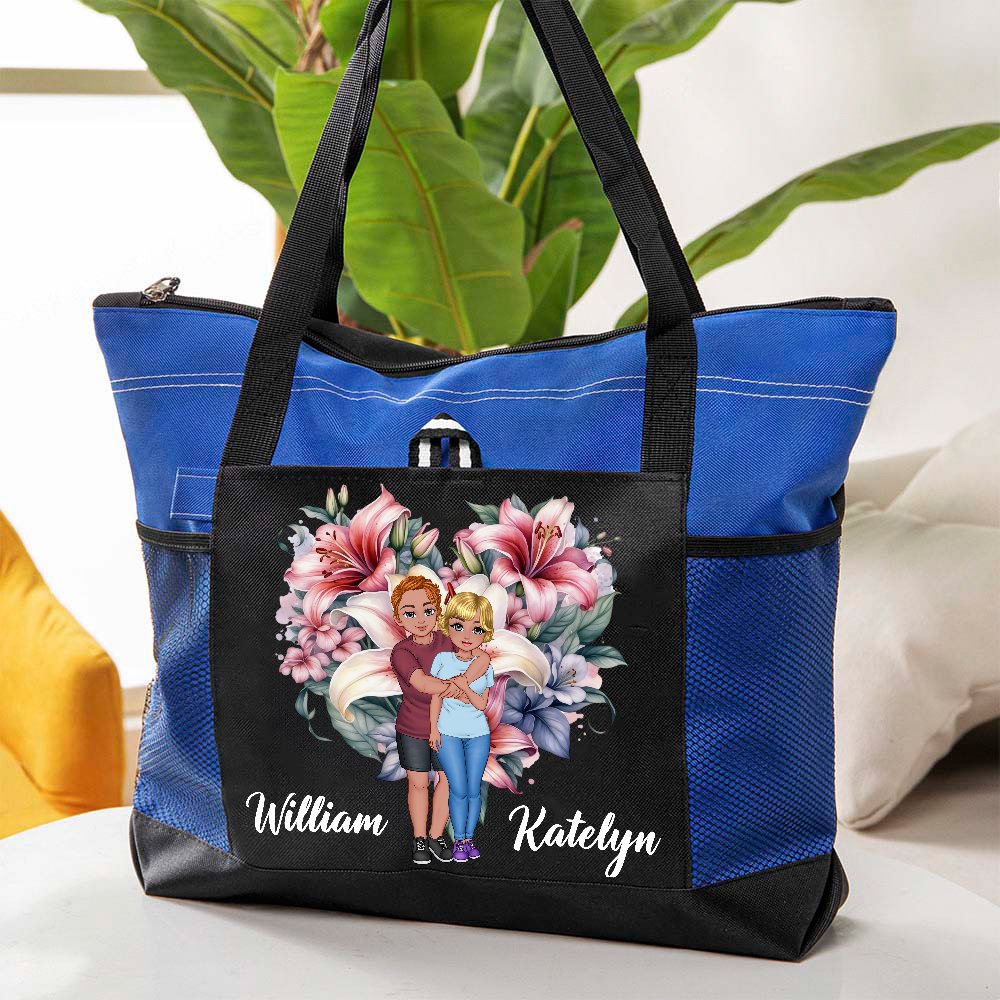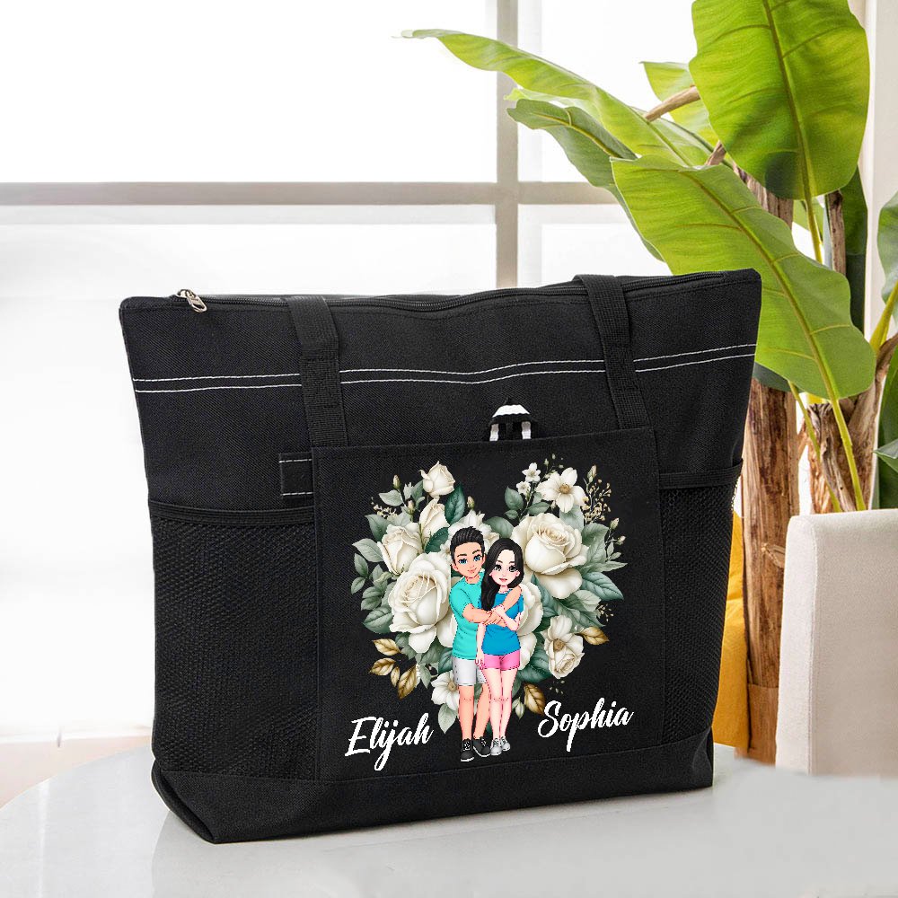 Featuring a charming cartoon illustration of an embracing couple surrounded by heart-shaped flowers, this large canvas tote is a delightful expression of love and affection. You can also customize the name according to your preferences to create your own exclusive handbag.