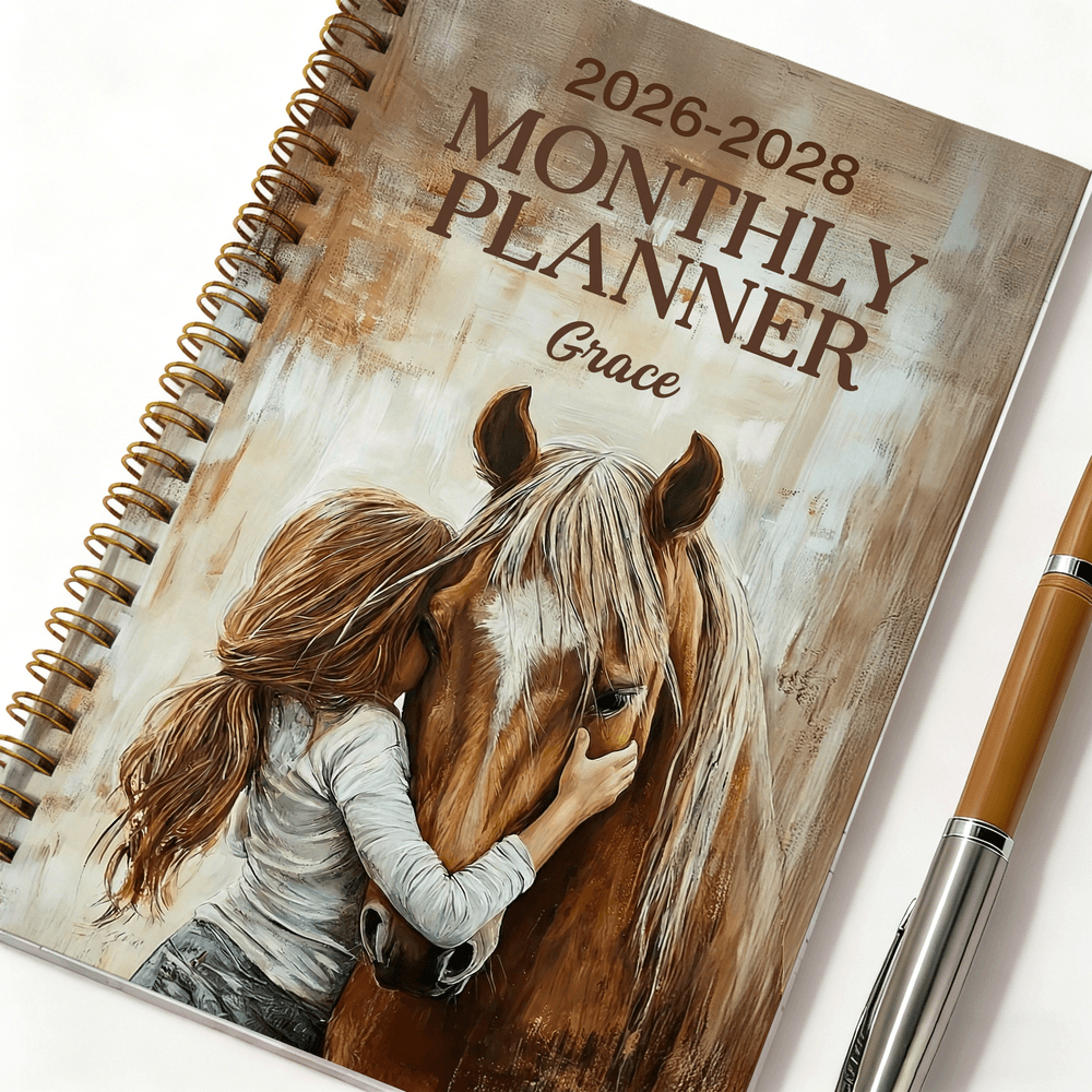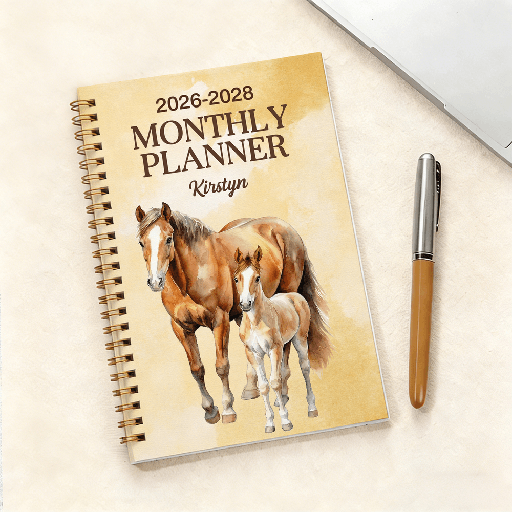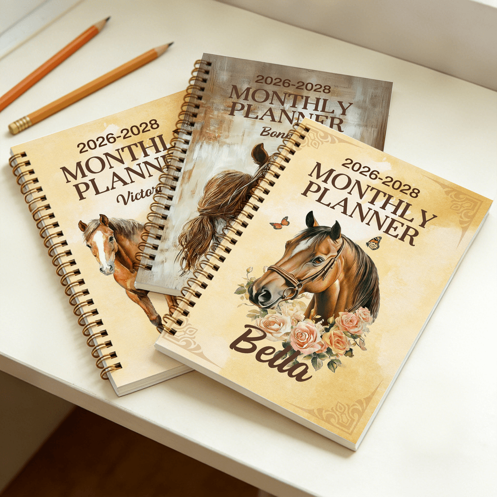 The notebook cover features an intricate horse design, accompanied by the option to customize with your name, making it a perfect gift for horse lovers and equestrian enthusiasts. The thoughtful design not only reflects a passion for horses but also adds a personal touch that makes planning enjoyable and meaningful.