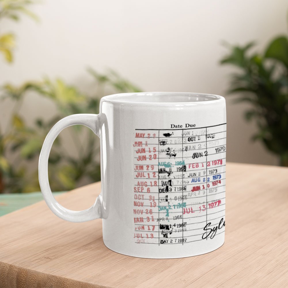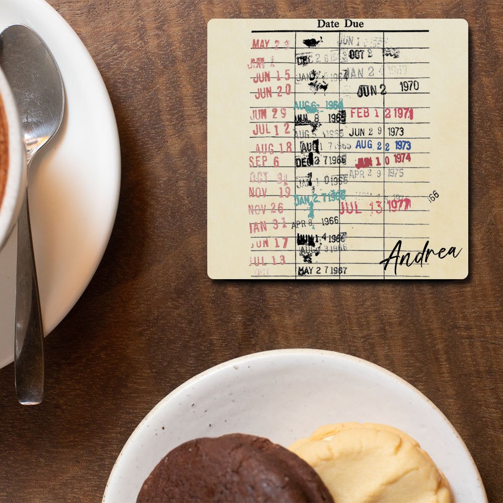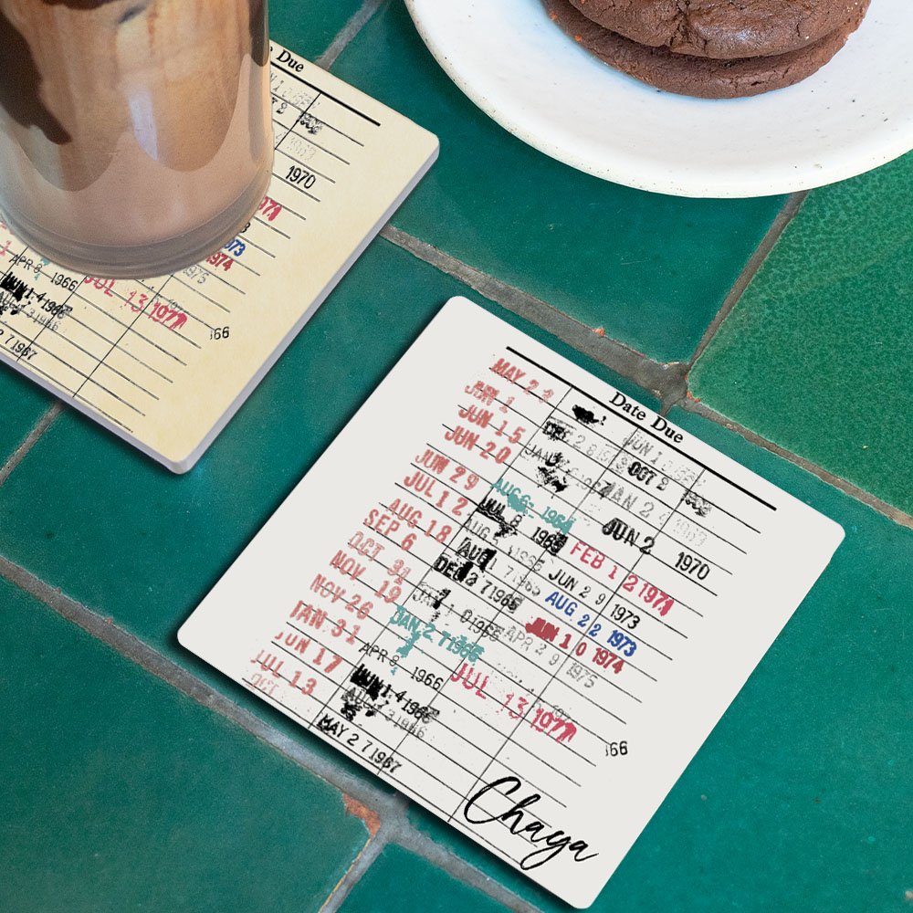 The mug and coaster feature a vintage design and contain a pattern of the library date-due card. It will add a little vintage charm to your morning routine and instantly create a vintage feel for your home, office, or shop.