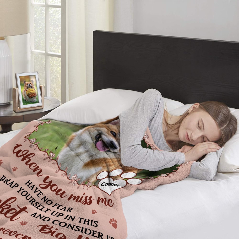 This blanket is customized with the pet's photo decorated with a wreath and the name on a paw print, making it more intimate and unique. With the thoughtful phrase "When you miss me, have no fear, wrap yourself up in this blanket and consider it a big hug..." you can feel the warmth and companionship whenever you gaze at it as if the pet has never left.