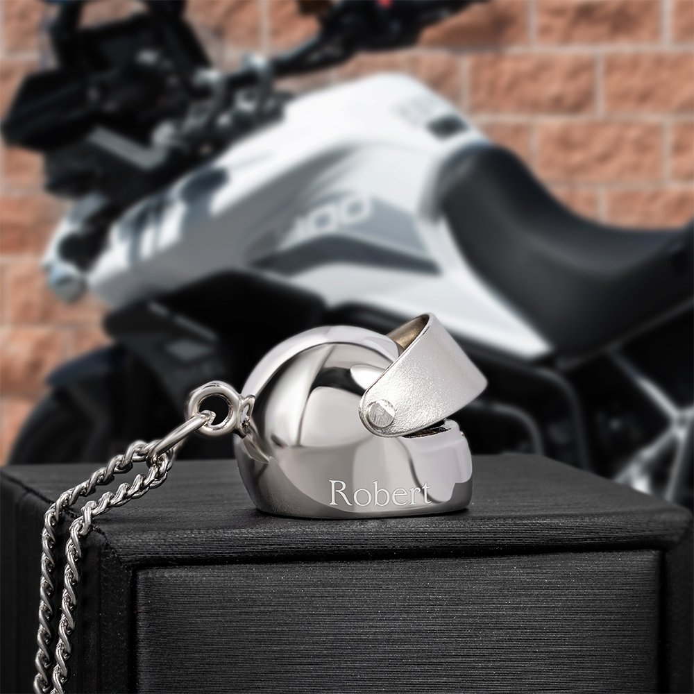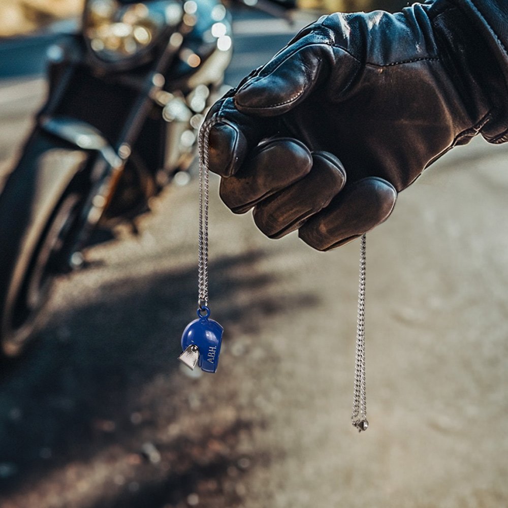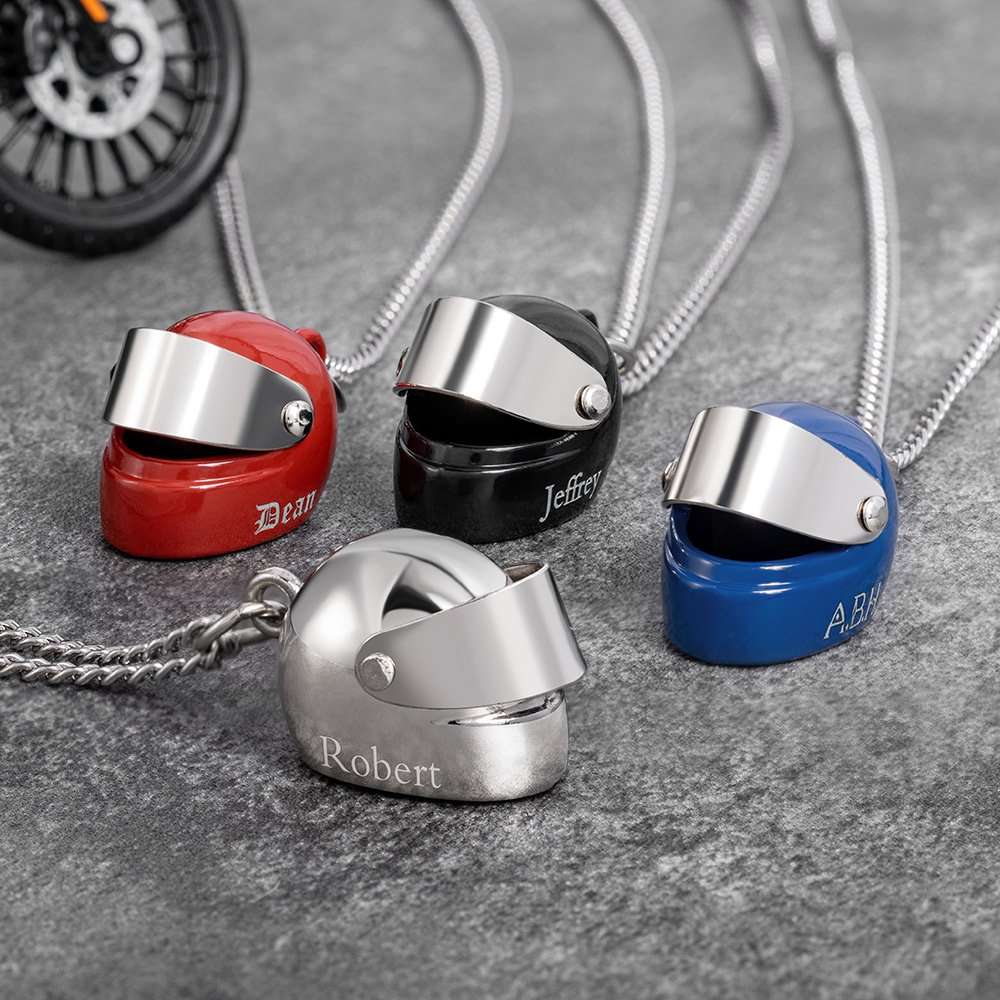 This personalized motorcycle helmet necklace is a delightful and significant gift for motorcycle lovers. Its sleek design reflects a passion for riding, and you can engrave a name to create a unique keepsake. Choose from four vibrant colors: silver, blue, red, and black, to match individual styles.