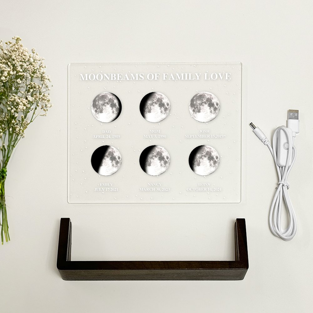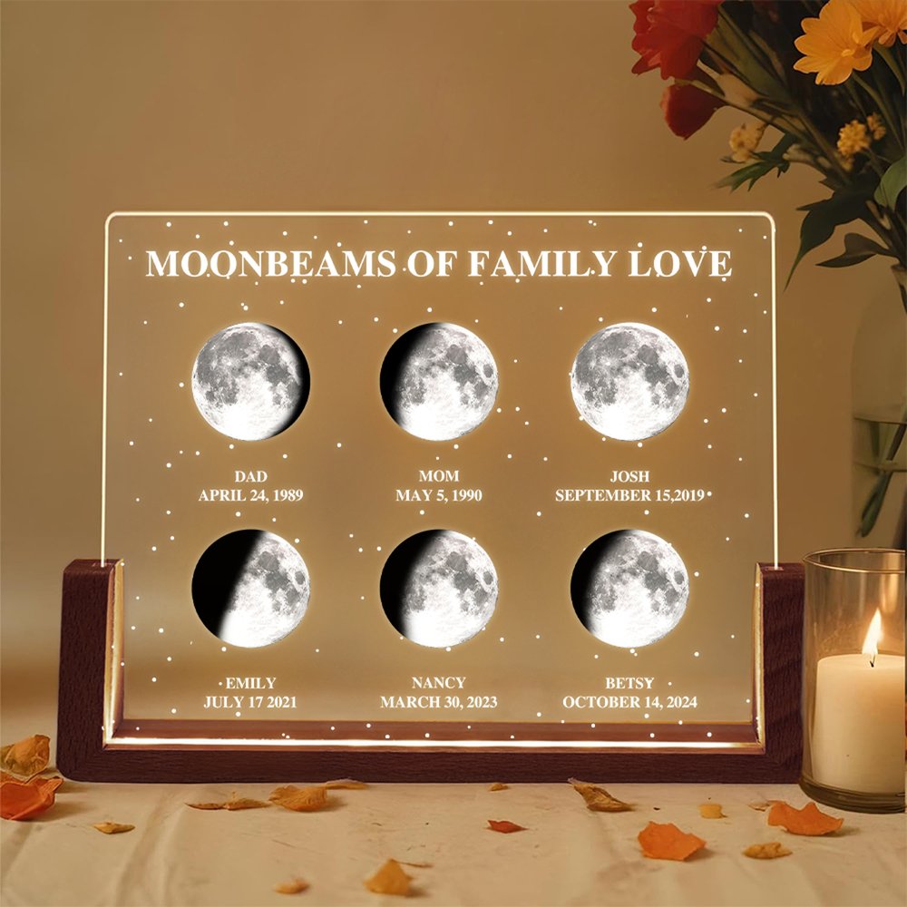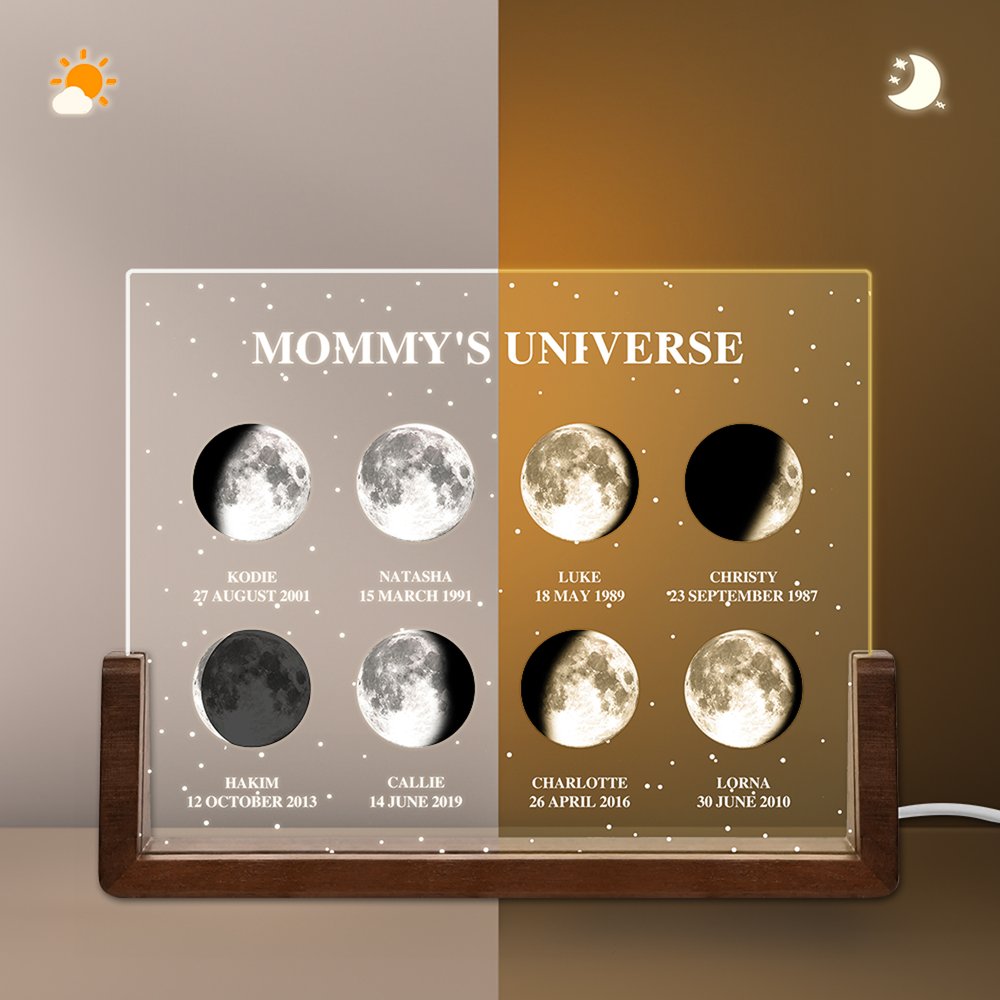 You can customize the title, names of 1-8 people, birthdays, and moon phases for your birthdays, transforming your "personal moonlight" into a cozy nightlight. Its soft glow illuminates the night, preserving important family moments in a romantic, star-studded way. Whether documenting a child's growth or family memories, it becomes a unique timepiece.