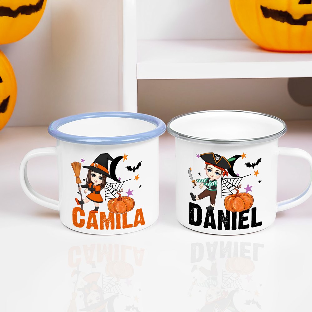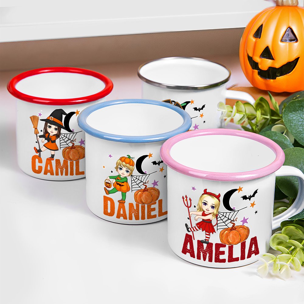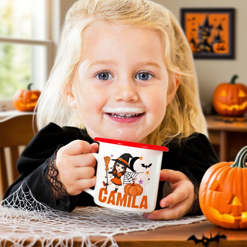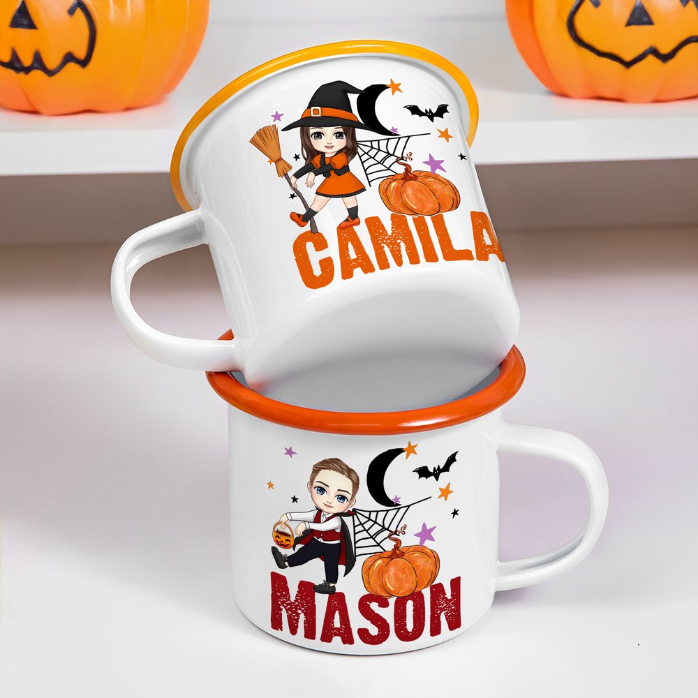 The cup showcases lively Halloween cartoon characters, surrounded by charming pumpkins, bats, spider webs, brooms, and stars. You can customize it with your child's cartoon likeness and name, perfectly blending the fun of the holiday with personalized elements, making this enamel mug a special holiday keepsake.