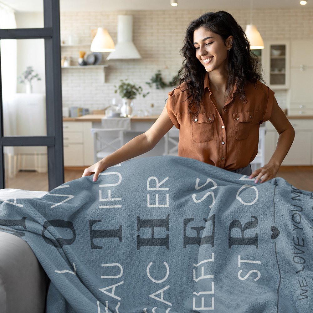 The blanket spells out the word mother with some beautiful letters in the words, telling people that the lasting love provided by mothers is selfless. Evocative words and carefully chosen colors combine to create a truly captivating and unique touch that celebrates the nurturing and caring nature of motherhood.