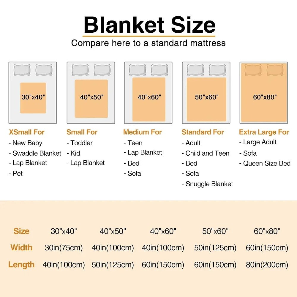 | Measurement: | Fleece Blanket: 30" Γ 40"(75cm Γ 100cm), 40" Γ 50"(100cm Γ 125cm), 40" Γ 60"(100cm Γ 150cm), 50" Γ 60"(125cm Γ 150cm), 60" Γ 80"(150 Γ 200cm) |