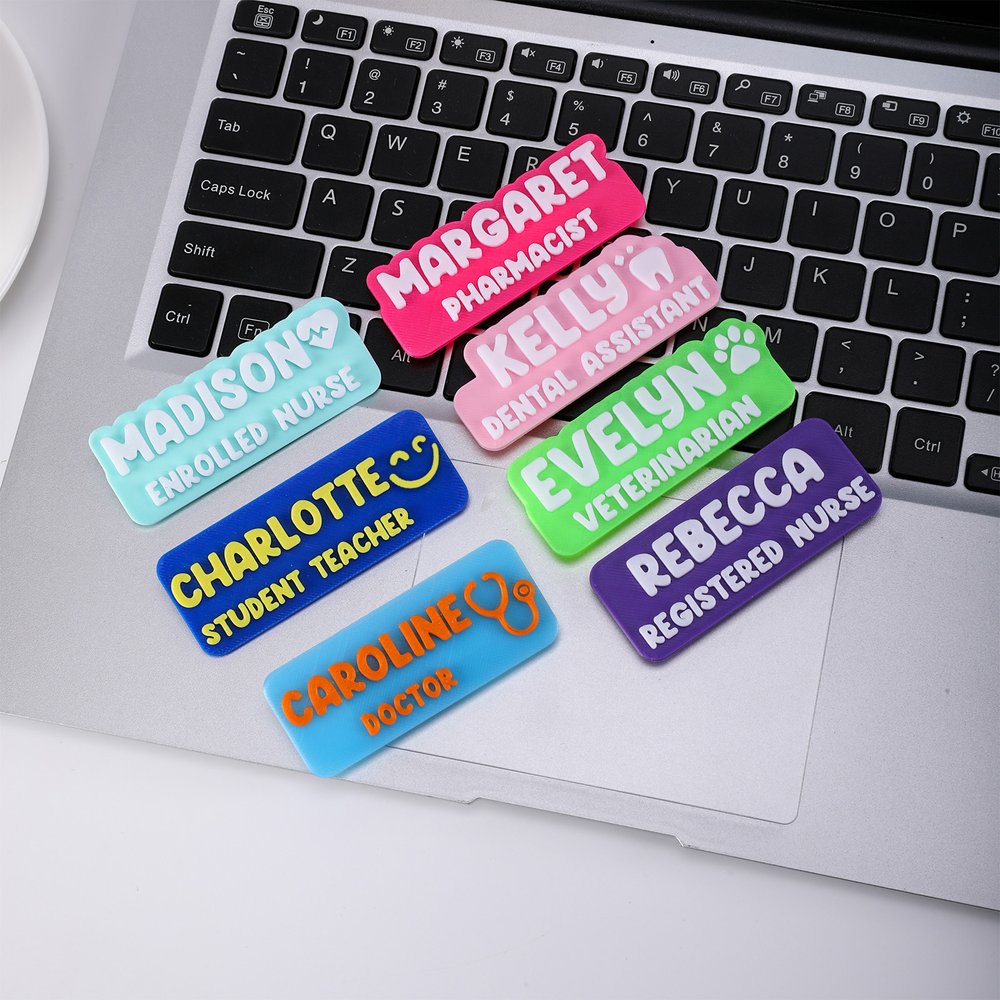 This badge is uniquely designed and creative, with two shapes available: cloud and rectangle. The badge surface uses 3D printing technology, and the customizable name, occupation, and symbol have a three-dimensional effect, with a noticeable touch, which enhances the visual layering. The colors are bright and rich, adding a lively atmosphere.