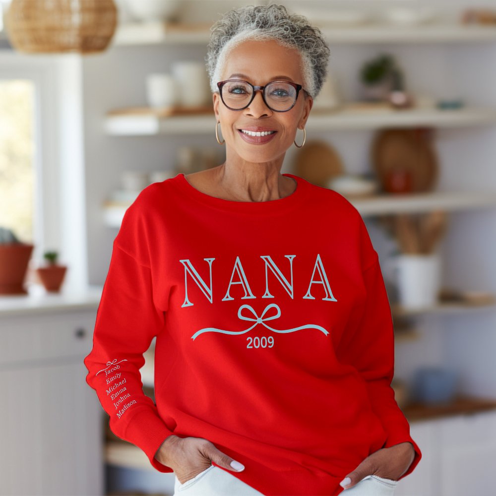 This ultra-soft clothing is a heartfelt tribute to a grandmother's love. It beautifully showcases the names of 1-12 of her grandchildren, adorned with charming bow accents. Personalized it with an endearing nickname like "Mimi" or "Nana" to celebrate her unique identity as a grandmother, transforming an everyday item into a treasured heirloom.