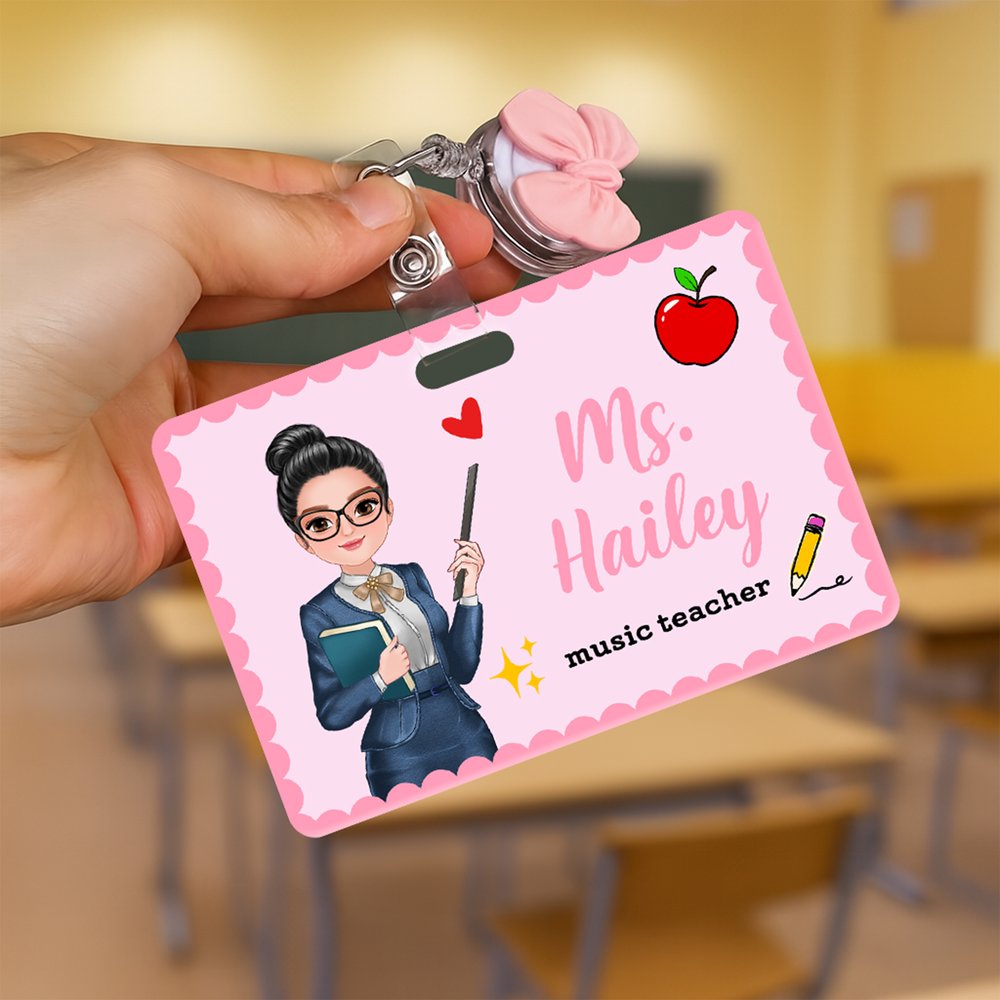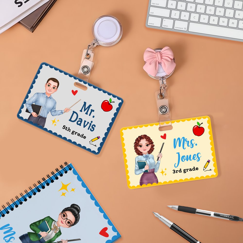 At its core, this badge showcases a charming cartoon character, artfully integrated with educational motifs such as books and rulers to form a vibrant, engaging visual icon. Fully customizable with title, surname, and personalized text, each piece serves as a distinctive medium for individual expression while infusing a touch of formality into its design.