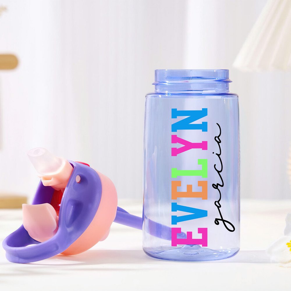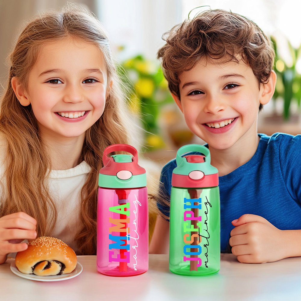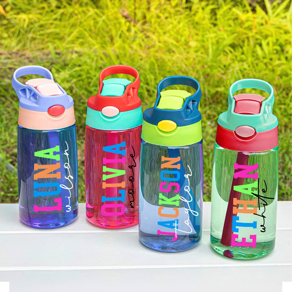 This water bottle comes in four fashionable colors: red, blue, purple, and green. Its stylish and vibrant design makes it a fun and attractive choice for children. You can customize the bottle with your child's first and last name, and the colorful name design adds a special touch, making each bottle a unique and cherished item for your child.