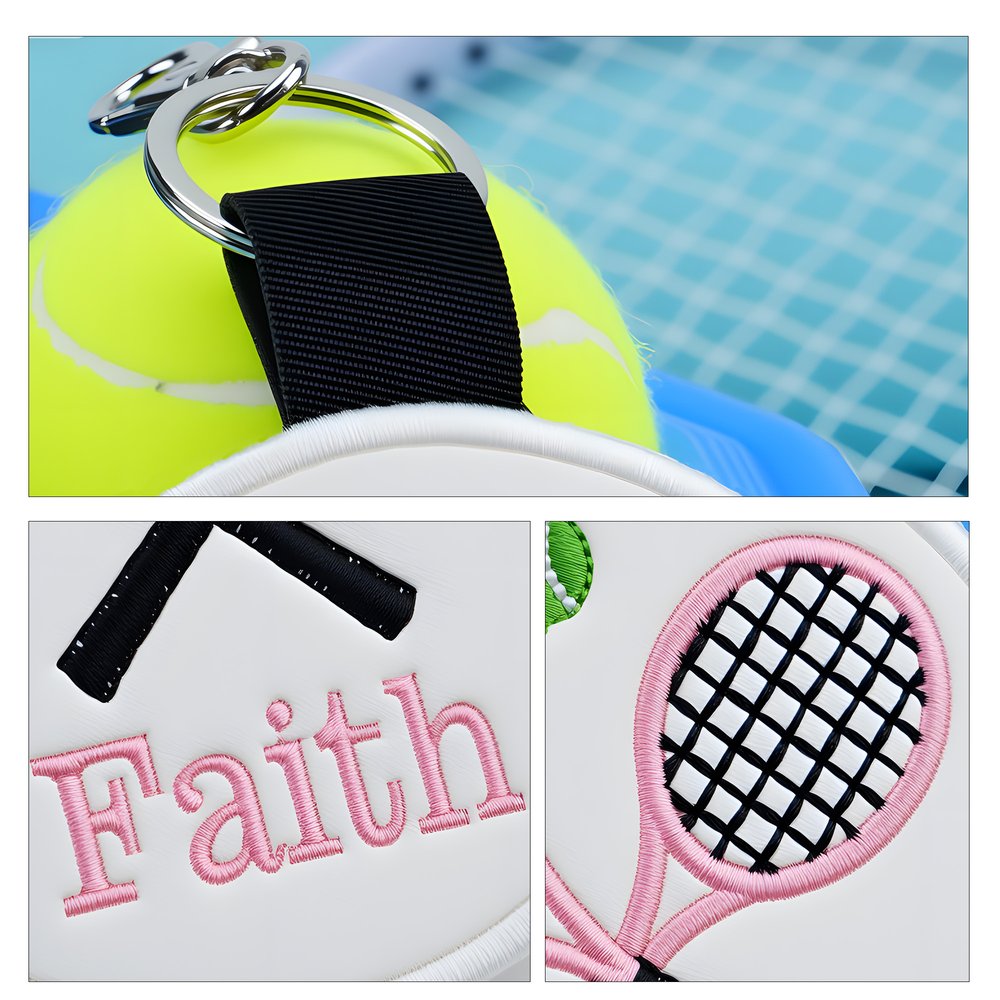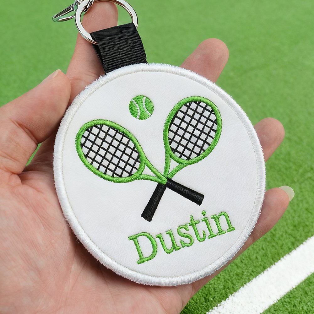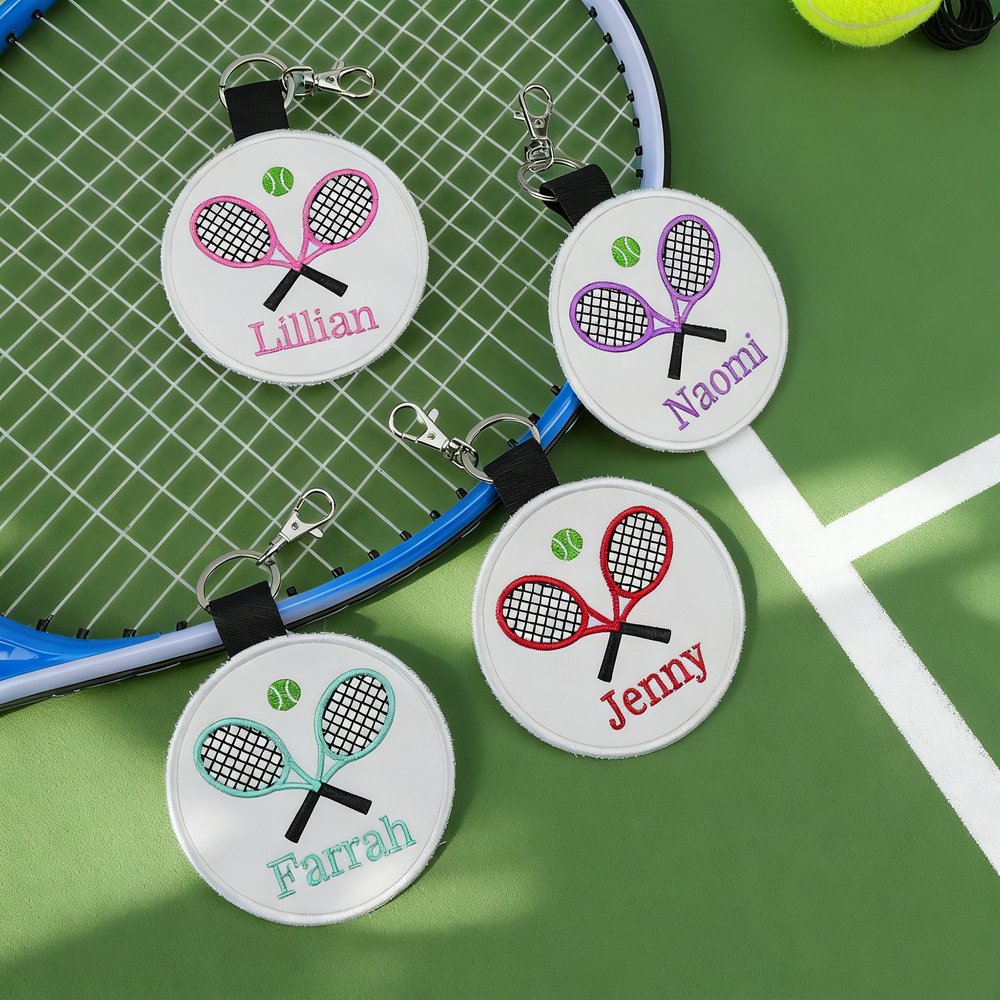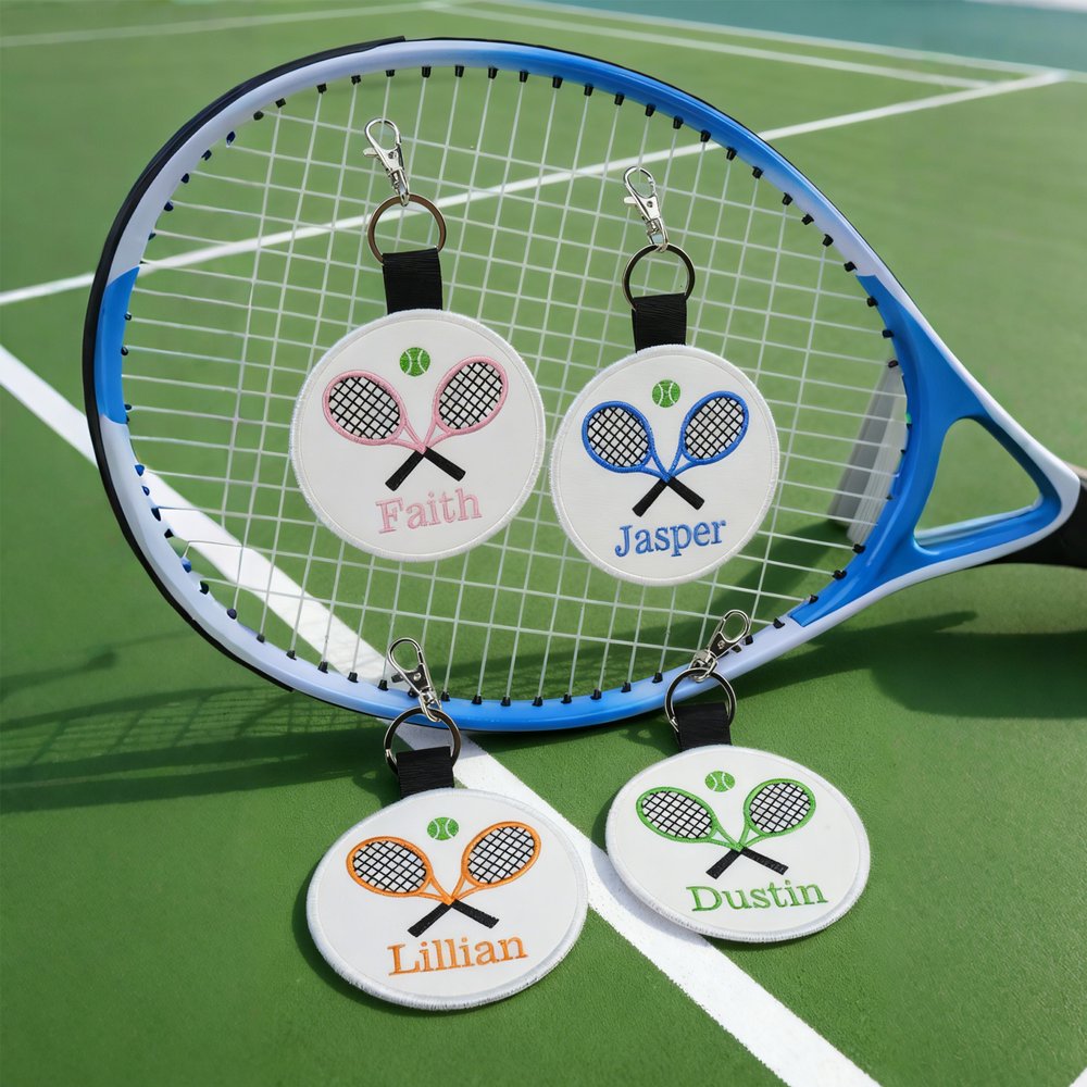 A classic racket and tennis ball pattern paired with a customizable name tag keychain subtly showcases exclusive status and sporty style. The rotatable lobster claw design is flexible and secure, allowing for easy attachment to a tennis bag or keychain, ensuring both practicality and visual recognition.