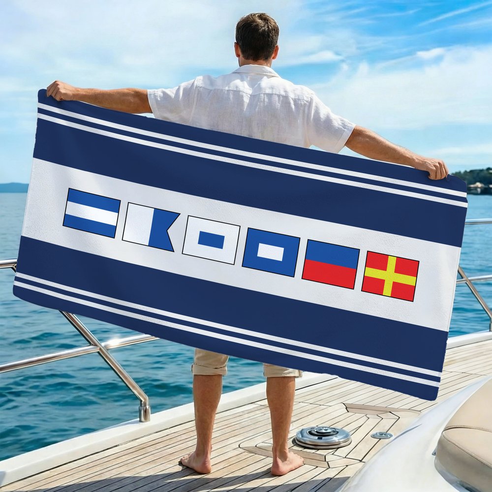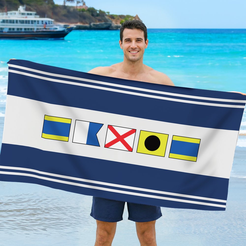 This beach towel features classic nautical signal flags, showcasing all 26 traditional maritime communication alphabet flags. Accented with colorful stripes and a personalized name, it creates a vibrant coastal-vacation vibe. Visually refreshing and eye-catching, it's a highly personalized and distinctive gift, perfect for personal use or as a present.