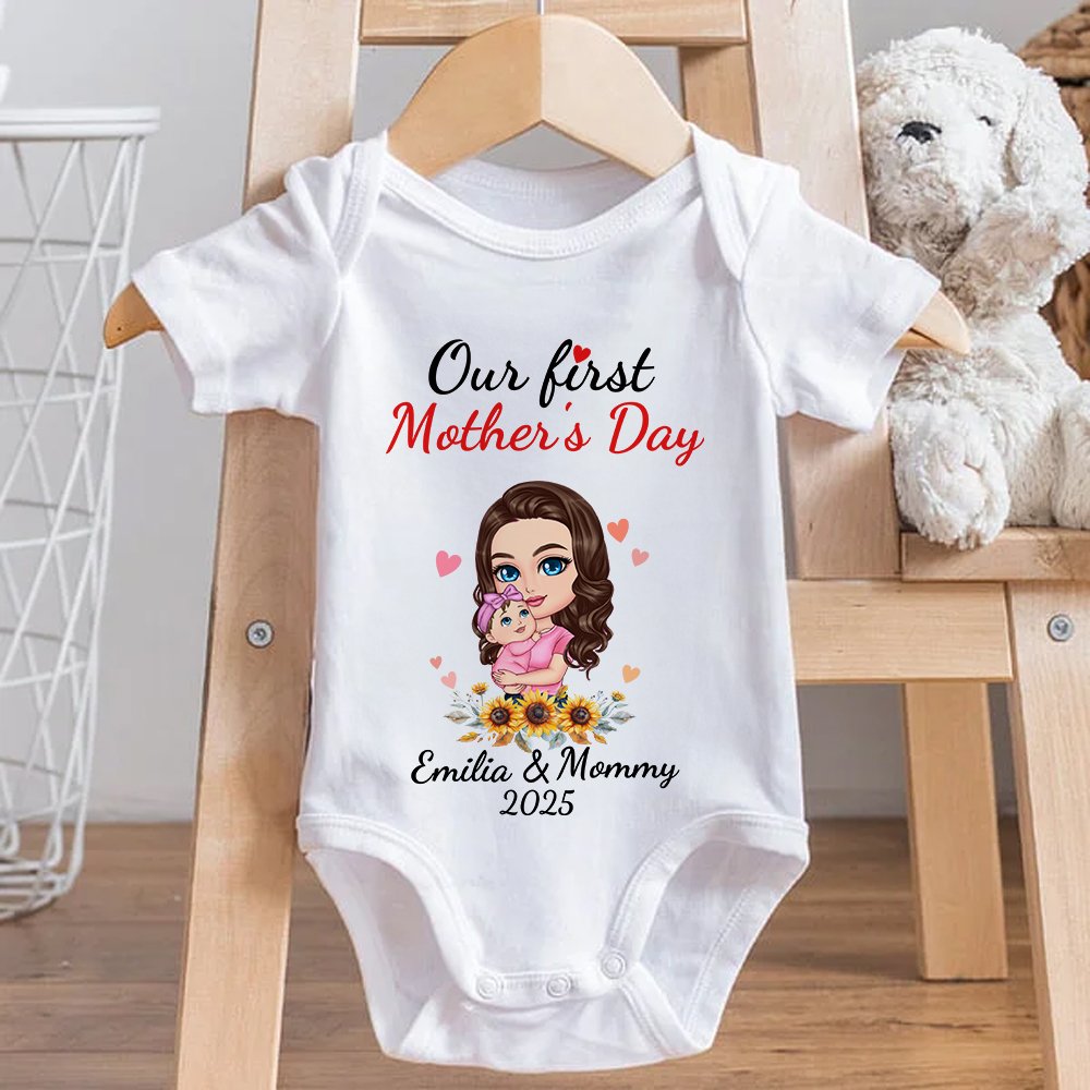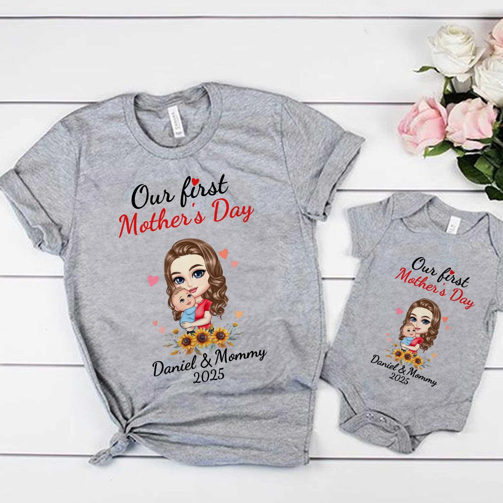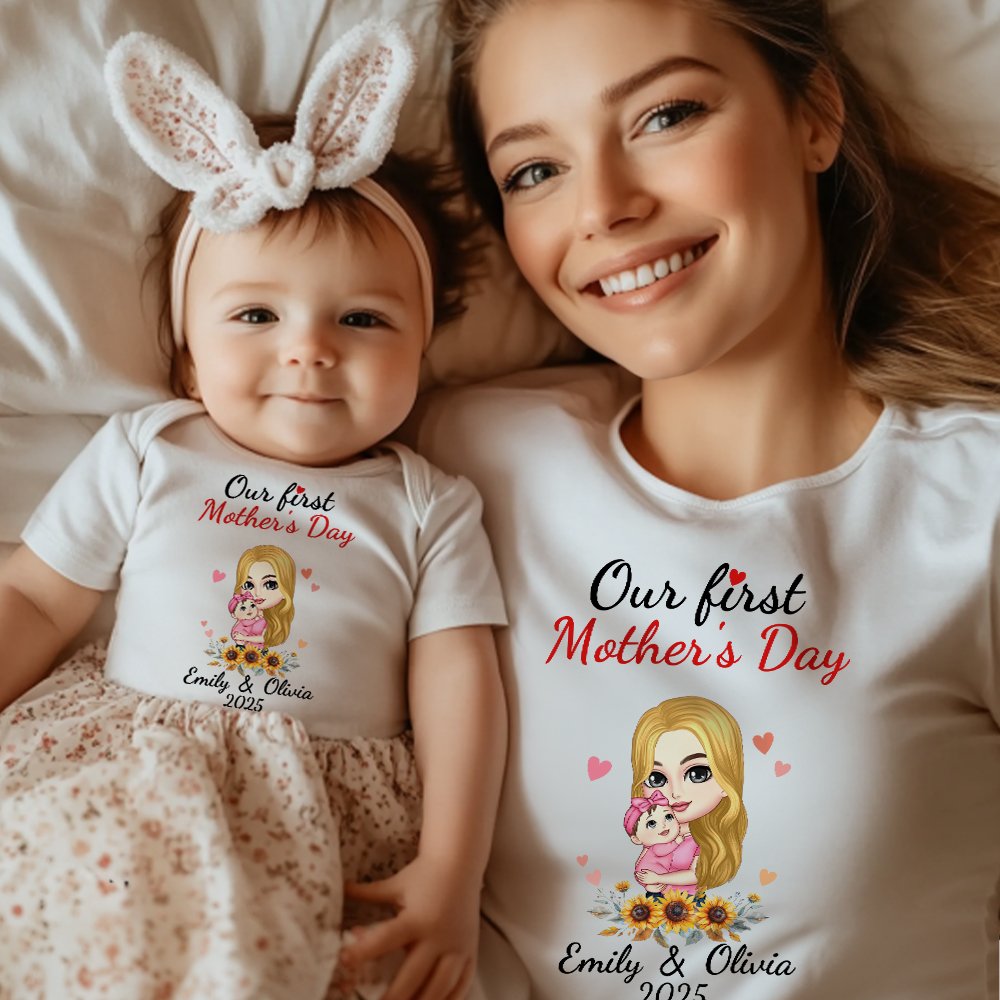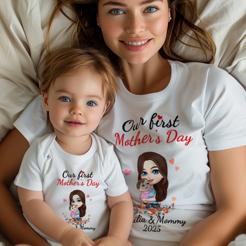 The design features a mother holding a cute baby in her arms, with flowers and love background elements, making it warm and happy. To really make it unique, you can personalize the mother and child's name, as well as the year, and add the title "Our First Mother's Day" to create a unique parent-child outfit.