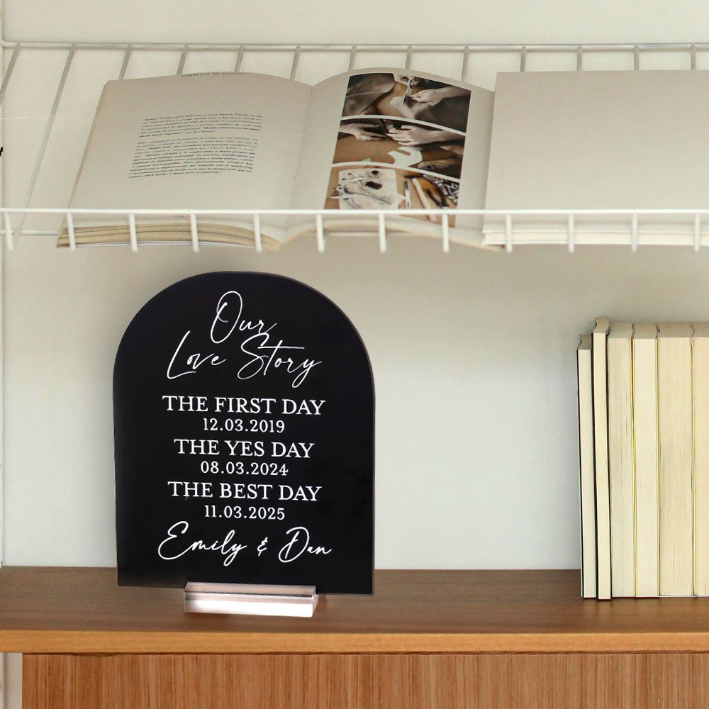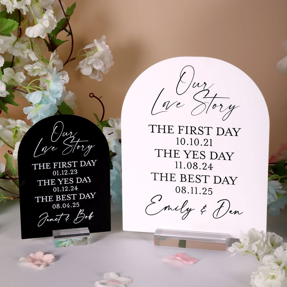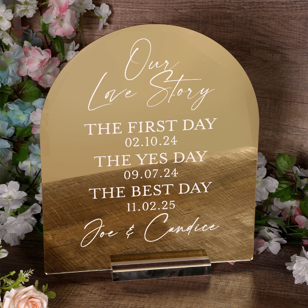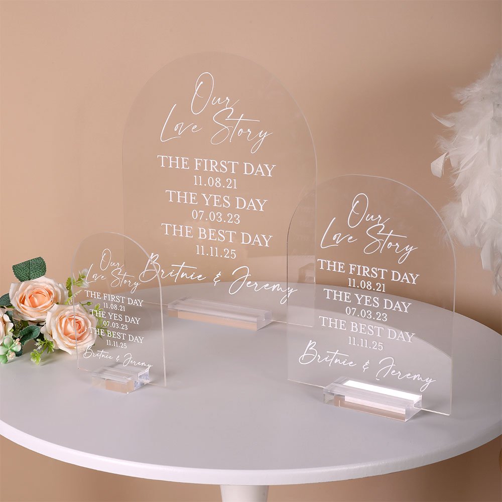 Our acrylic wedding sign, featuring the words "Our Love Story", captures the cherished memories between you and your beloved. From the first day you fell in love, to the moment you said "yes" to the proposal, and the best date of all, every milestone can be beautifully printed. Beneath these meaningful dates, you can add both of your names, allowing you to reminisce about your journey of love and warmth whenever you gaze upon this acrylic plaque in the years to come.