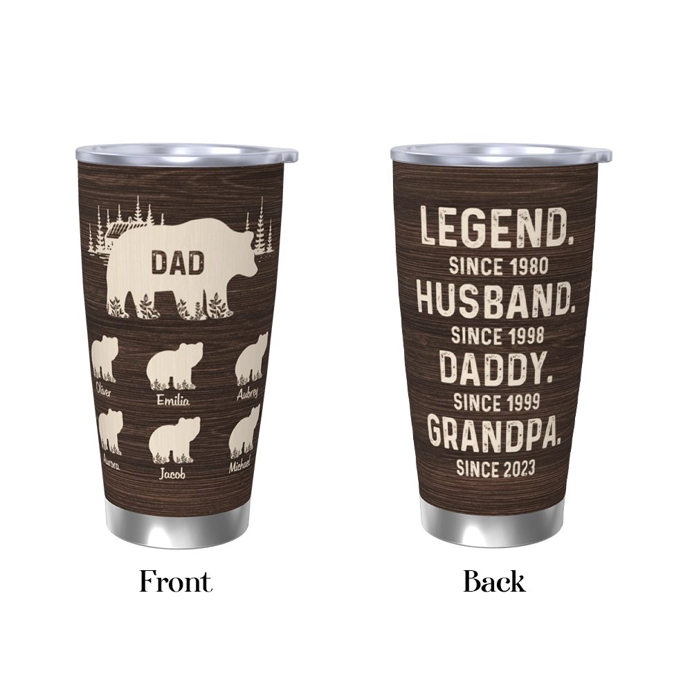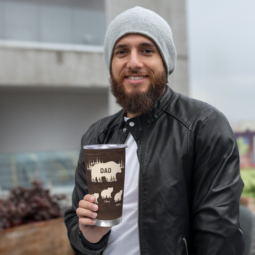 The tumbler features a bear pattern on the front, and can also include a nickname and name. It is a symbol of intimacy with children. The back of the tumbler can be customized with different texts and years. The unique design of this tumbler makes it a very memorable gift.