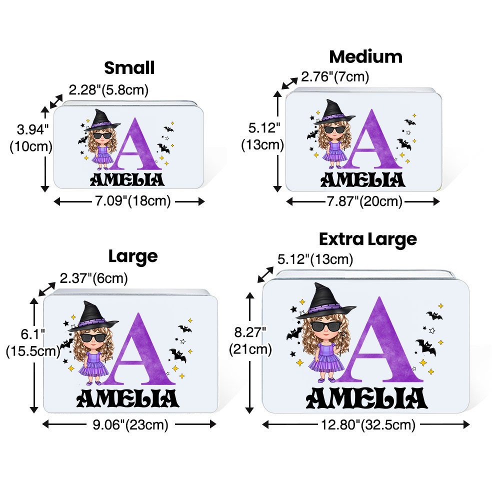The tin features a cute, customizable cartoon character image with a Halloween-themed design, ideally for kids. From hair color to clothes style to wing color, children can customize their names and their favorite cute Halloween theme image and create a Halloween gift that is unique to them.