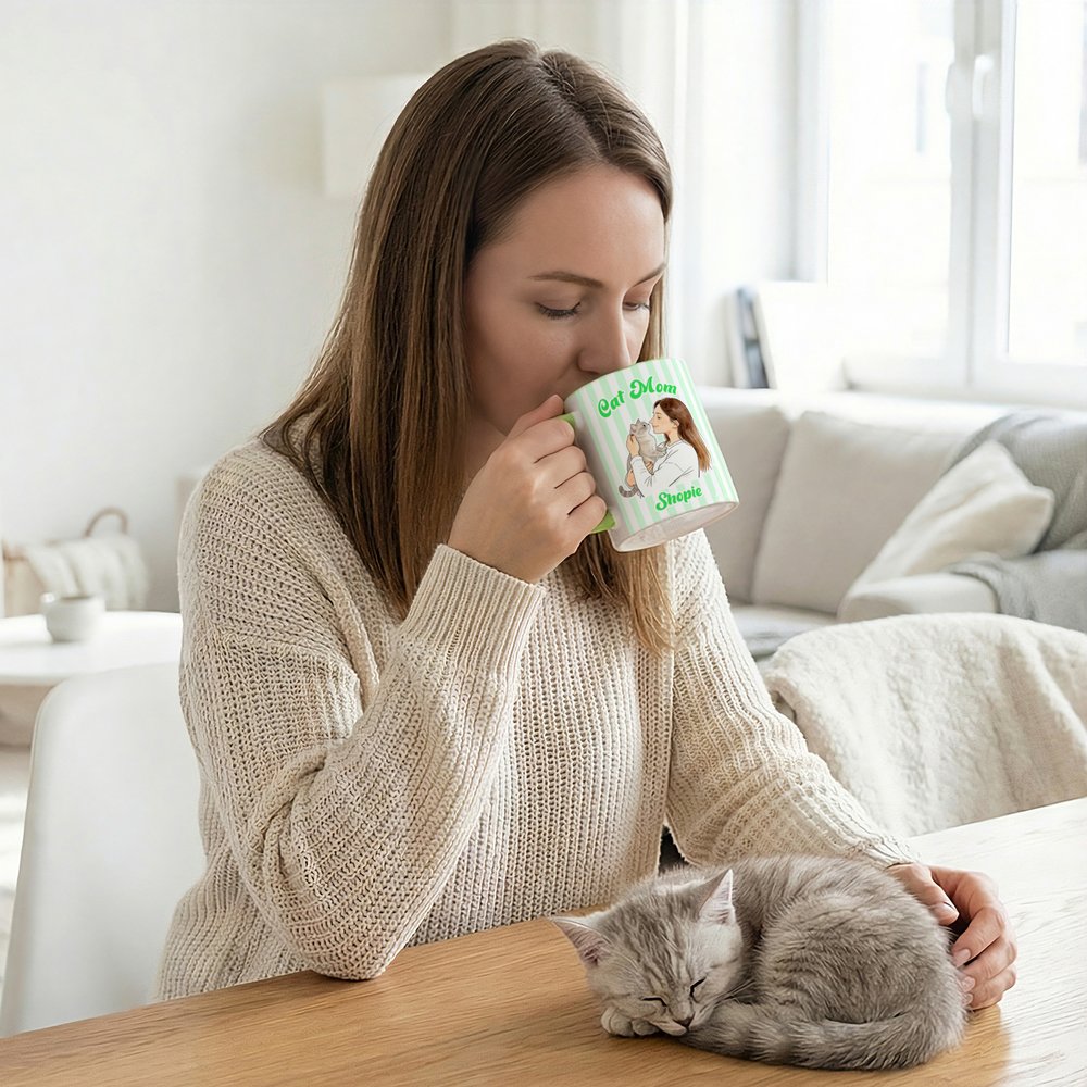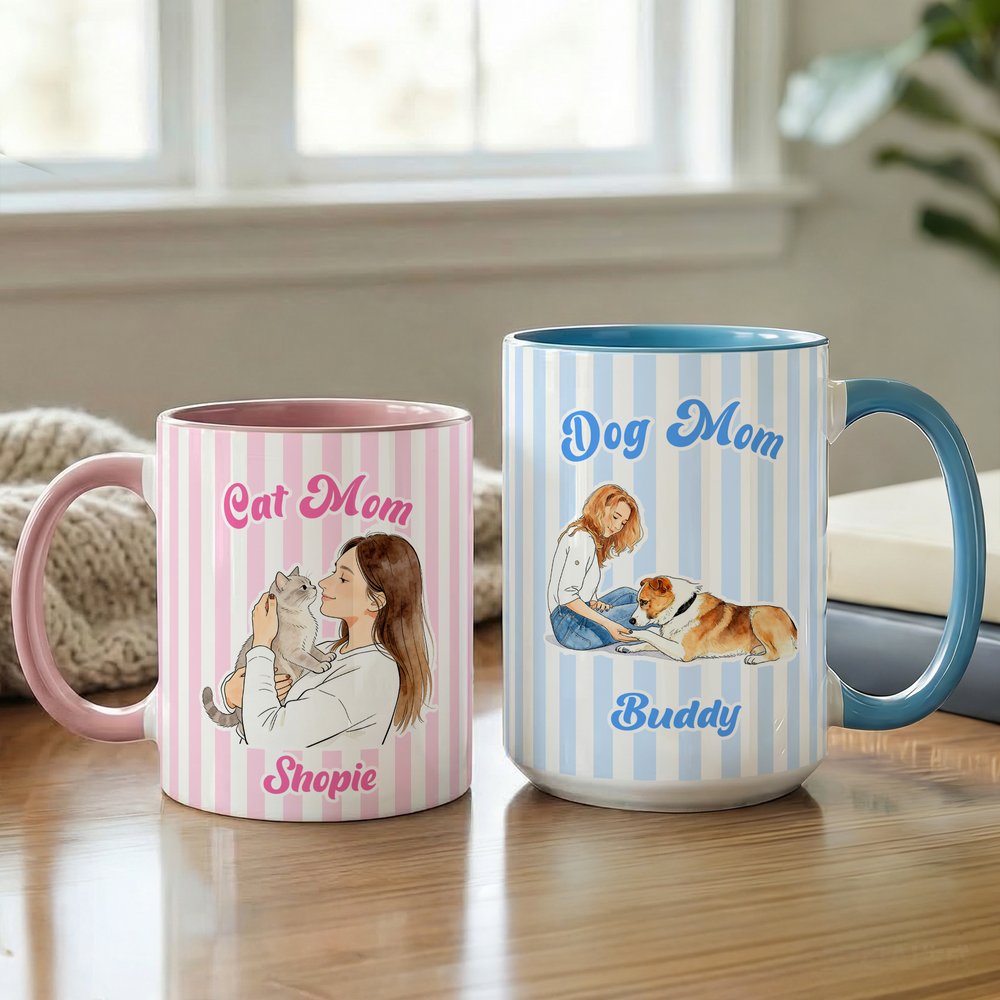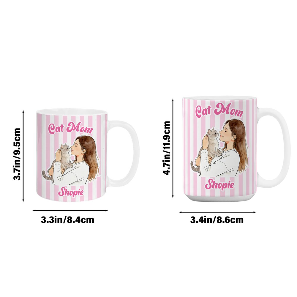 The mug features a cheerful, retro-inspired design with a soft striped background, adorned with a warm watercolor illustration of a pet mom sharing a loving moment with her dog or cat. The bold, playful script for the Dog Mom or Cat Mom title and pet’s name complements the whimsical illustration, while the vibrant colored handle adds a pop of personality.