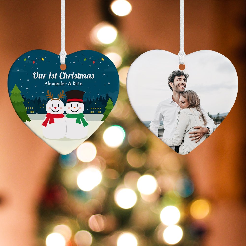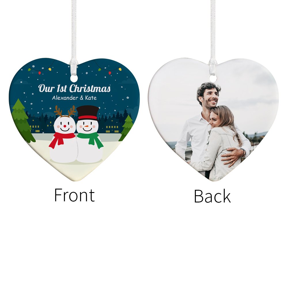 You can customize a snowman couple with a cute Santa Hat, Top Hat, Elk, and Ear Muff style to choose from and a red or green scarf, adding content such as a wedding anniversary and names to show your love, and finally uploading a photo of yourself. Because such a unique and exclusive ornament is created, your love will bloom fully in the winter.