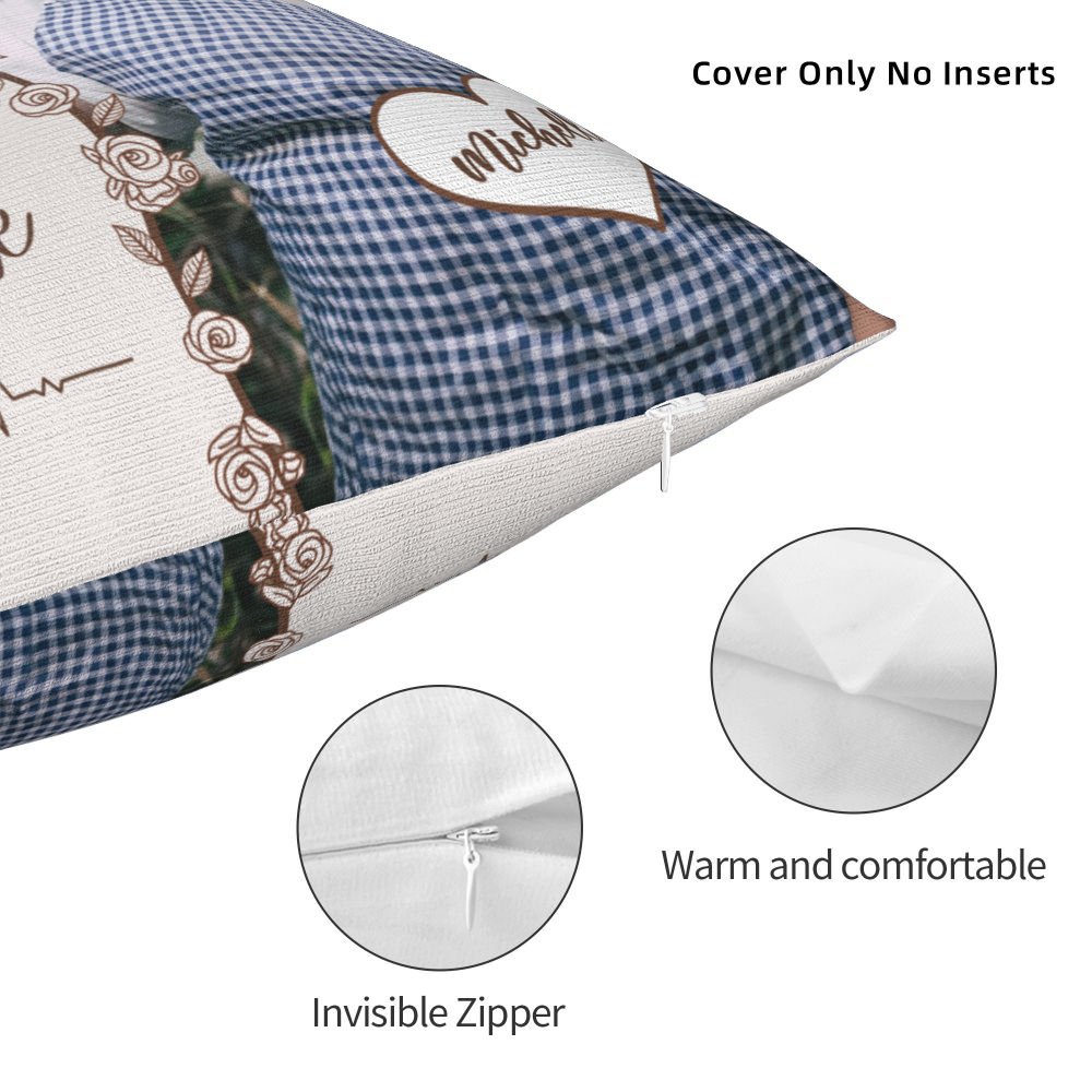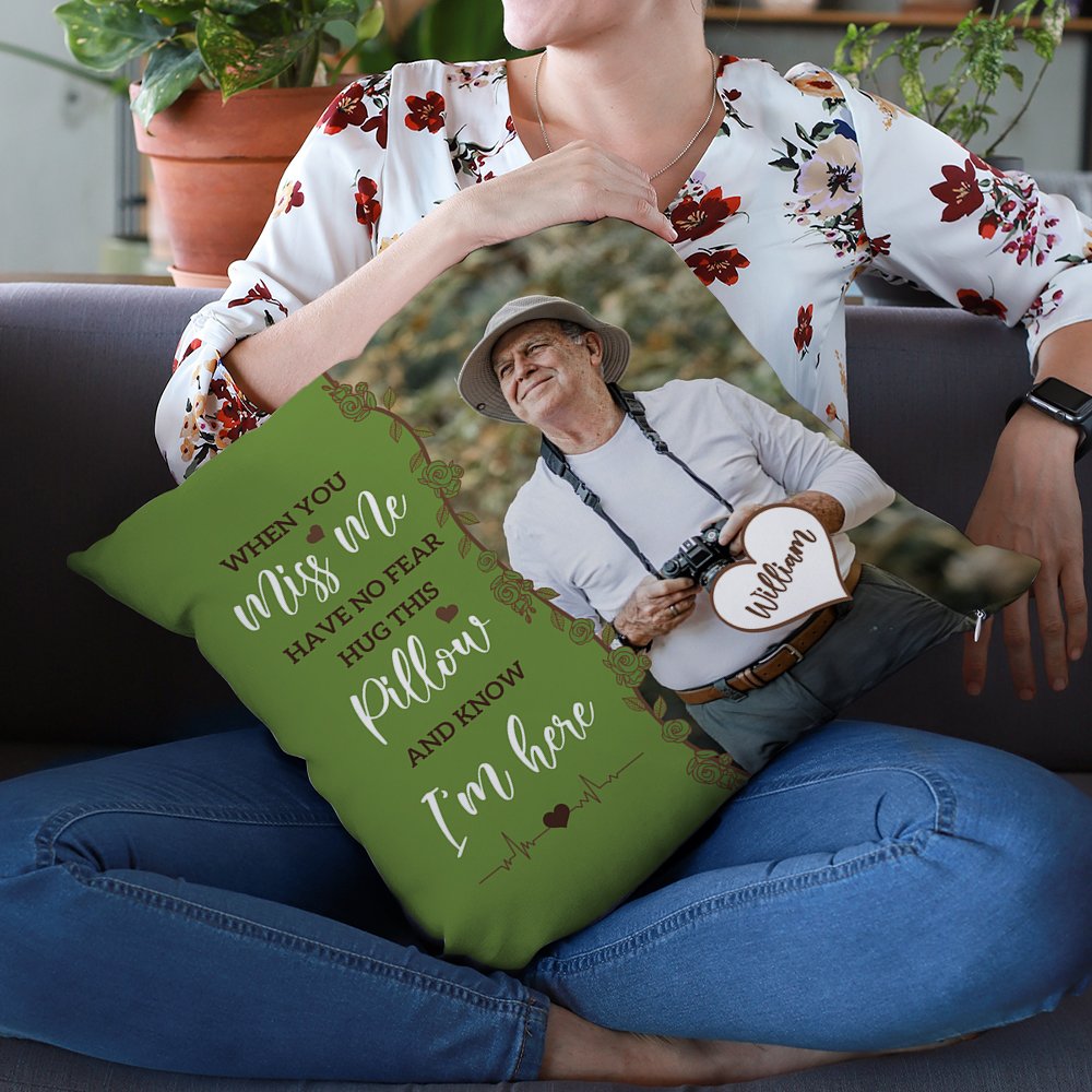 This pillow features a heartfelt design divided into two parts. The left side displays the comforting text: "When you miss me, have no fear, hug this pillow and know I'm here." The bottom showcases a heart icon and ECG elements, adding an intimate touch. On the right side, you can personalize the pillow by printing a photo of your loved one, allowing you to feel their presence whenever you use it.