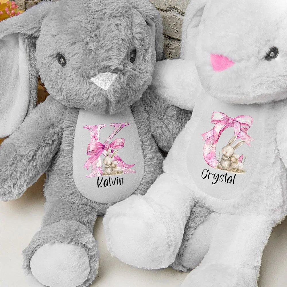 This adorable plush bunny toy is the perfect Easter gift for kids, featuring a customizable belly area where you can add a pink or blue bow initial and the kid's name. It's a unique and thoughtful present that will be cherished for years.