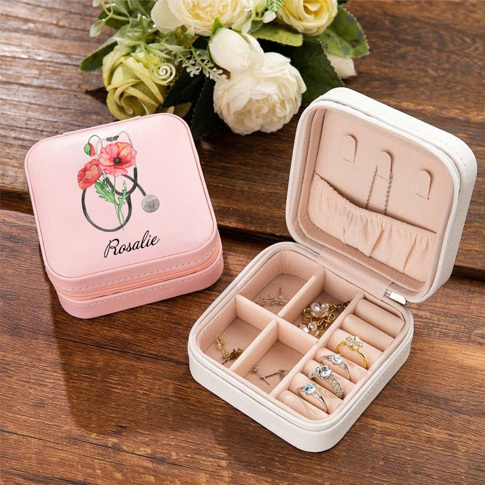 This personalized jewelry box combines elements of a birth flower and a stethoscope designed for nurses. Choose a flower to represent your birth month and customize it with your name. Each jewelry box is unique.