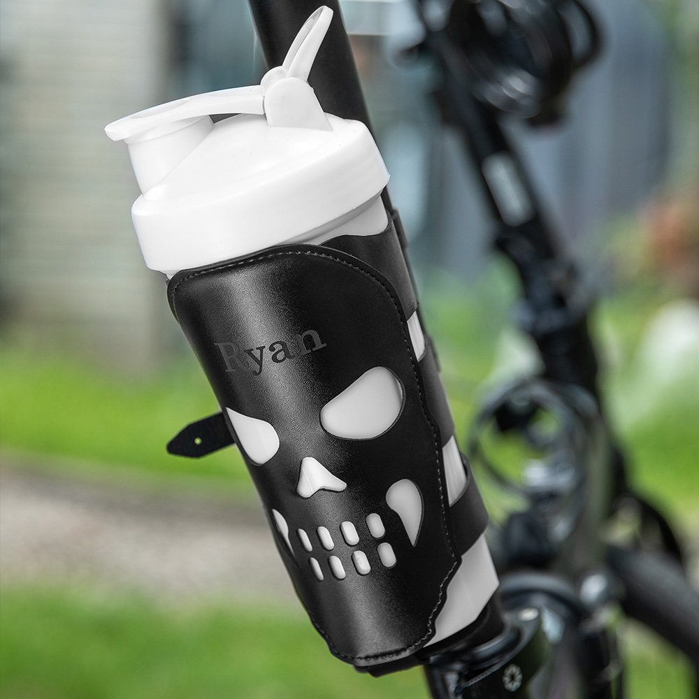 The stylish drink holder is handcrafted from high-quality PU leather with a laser-cut skull.